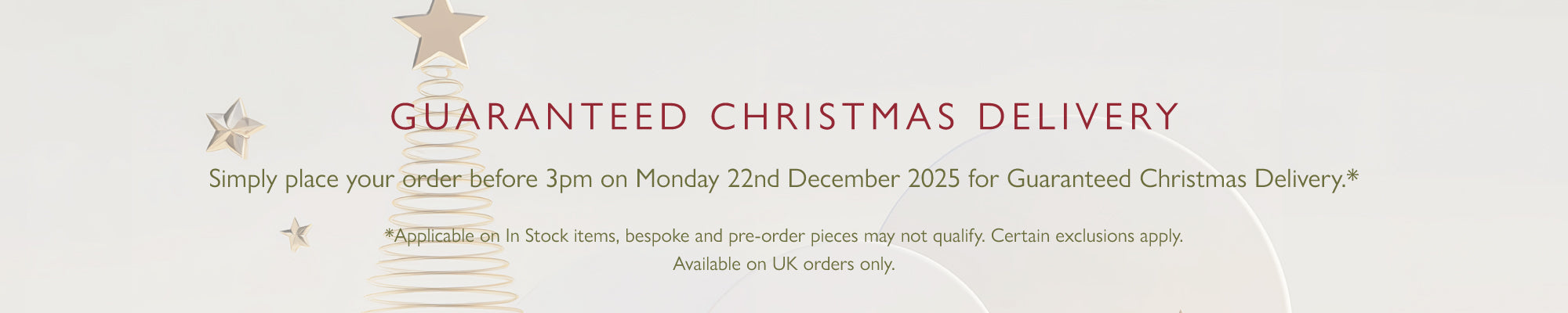 Please be mindful that there is a limited postal service during bank holiday periods (especially Christmas) so if you wish to receive your order for a specific date, please allow sufficient time and place your order in advance. If your delivery time is affected by events that are out of our control such as adverse weather conditions, we will endeavour to get your order to you as quickly as possible.