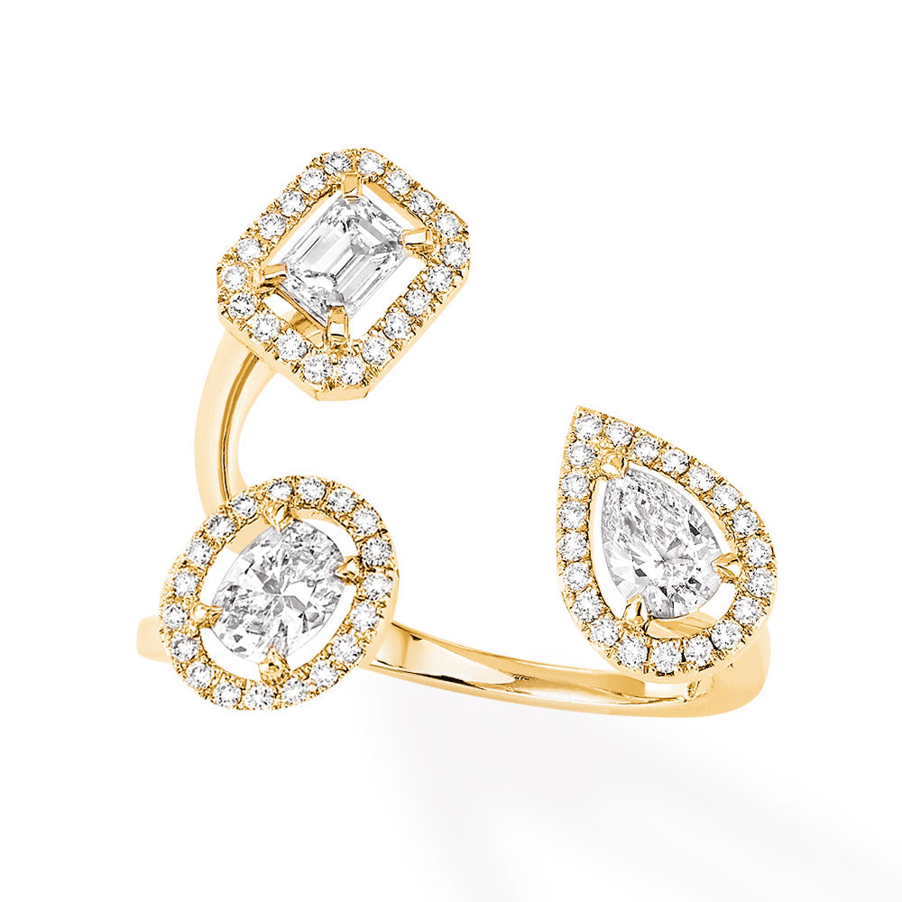 The Messika Gatsby jewellery designs are a mix of clean lines and effortlessly curving strands of gold that have been set with rows of delicate round-brilliant-cut diamonds. These pave set diamond finishes create an extra special touch of opulence and panache, especially when worn alongside professional or elegant evening attire. Alternatively, the Messika My Twin jewellery creations playfully intertwine different diamond cuts with eye-catching shapes that form open ring and earring structures. Pear-cut diamonds and emerald-cut diamonds are showcased throughout this line of white or rose gold creations, surrounded by frames of smaller round brilliant-cut diamonds. These open ring and earring designs leave a gap between the two scintillating diamond stones and can be paired with other pieces of jewellery from the same collection.