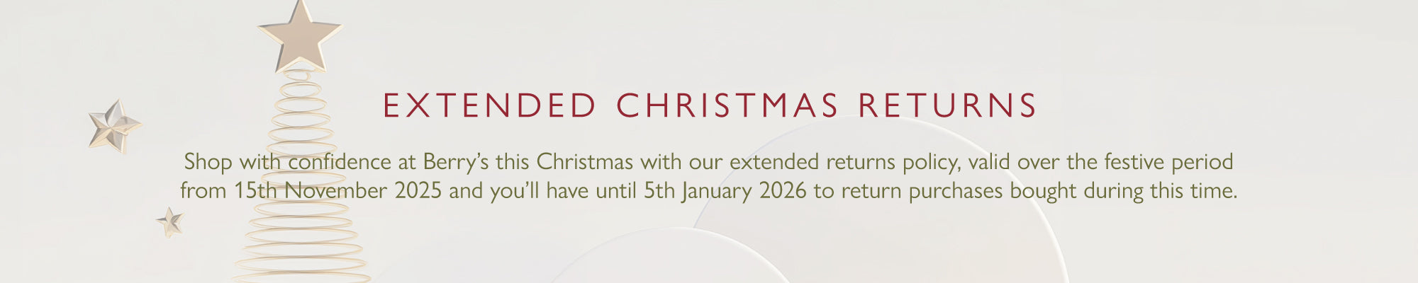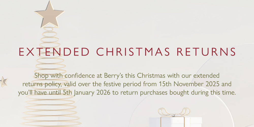 Any eligible item purchased between 15th November 2025 and 5th January 2026 may be returned for a full refund or exchange within this timeframe. This excludes bespoke items, personalised items and custom orders. Please make sure that the product is in its original packaging, accompanied by proof of purchase (receipt or dispatch invoice) and the Berry's swing tag is still attached, and return the unworn item to us via post or in-store within this timeframe.