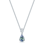 This unique pendant from Berry's jewellers showcases a spectacular pear cut green zoisite gemstone and a dazzling pear cut diamond to create a striking design. The two pear cut stones are held securely in a classic three claw settings which enables maximum light to pass through each of the pear cut green zoisite and pear cut diamonds beautifully faceted edges creating a stunning display of fire and brilliance. The tapering tips of of the green zoisite and the diamond face one another – the top stone of which connects to a beautiful 18ct white gold chain and a clasp fastening. The diamond chosen for this design weighs 0.30 carats and the green zoisite has a carat weight of 0.26 carats Perfect for accompanying with a myriad of similarly styled white gold diamond jewellery creations from our collections here at Berry’s Jewellers, this pear cut green zoisite and diamond pendant will make a timeless addition to any lady’s growing collection of modern jewellery pieces.
