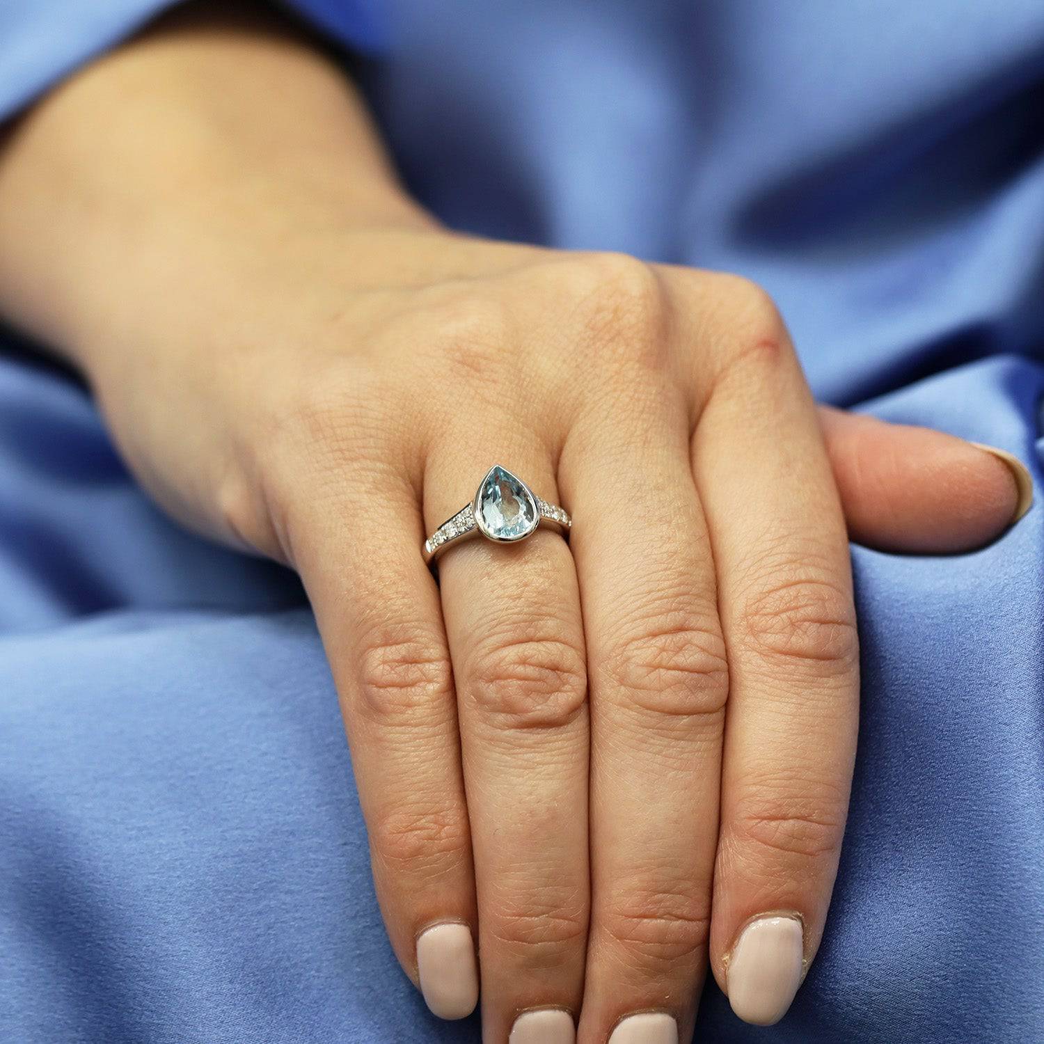 18ct White Gold Pear Cut Aquamarine Ring With Diamond Set Shoulders