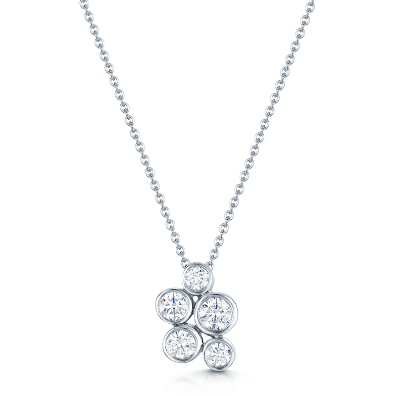 This beautiful diamond bubble pendant design from Berry’s has been crafted from lustrous 18ct white gold. The design features nine round brilliant cut diamonds nestled inside secure rub over white gold settings. Each diamond has been specially chosen for its unique fire and brilliance. This stunning diamond pendant hangs effortlessly from a 18ct white gold 43cm chain. The diamonds showcased in this white gold diamond necklace amount to a total of 0.75 carats.