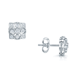 An intricate openwork diamond detailing creates a vintage inspired style in this pair of elaborately decorated white gold and diamond stud earrings from Berry’s Jewellers. The design belongs to our popular range of white gold and diamond jewellery designs. These white gold and diamond vintage square shaped earrings feature a central round brilliant cut diamond surrounded by a detailed millgrain edging. A further four smaller round brilliant cut diamonds in millgrain edging create a petal like openwork structure. Added charm and detail features in the surrounding sections of this centrepiece, with pave set diamonds trimmed by an inner and outer border of millgrain edging for an intricate finish. The diamond vintage inspired white gold earrings secure to the ears with a classic post and butterfly fastening to complete a comfortable fitting to the ears. The round brilliant cut diamonds chosen for these decadent vintage style diamond drop earrings amount to a total weight of 0.37 carats.