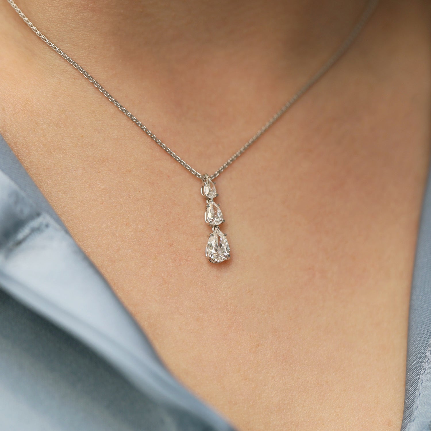- Featuring a trio of pear cut diamonds in a claw set graduated drop