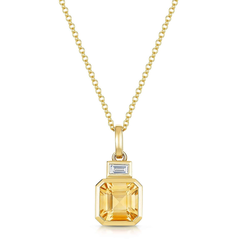 This stunning citrine and diamond pendant will add a pop of colour to any outfit. The citrine stone incorporated into this pendant has subtle golden yellow coloured tones. This captivating stone is perfect for combining with 18ct yellow gold from which this pendant is crafted. The design features an asscher cut citrine stone nestled inside a smooth polished rubover setting, above which sits a baguette cut diamond also in yellow gold rubover setting. The pendant is suspended from an 18ct yellow gold chain and secures with a lobster style fastening. The diamond amounts to a weight of 0.15 carats whilst the citrine gemstone has a sizeable weight of 2.25 carats.