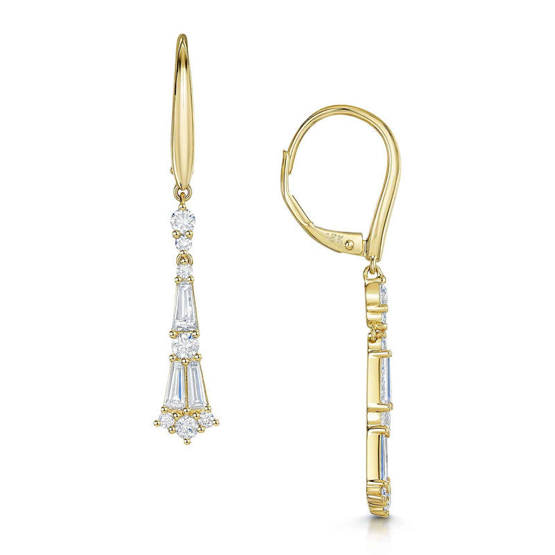 These beautiful diamond drop earrings personify vintage glamour and have been crafted from 18ct yellow gold. The harmonious mix of round brilliant and baguette cut diamonds together create an elegant art deco inspired look. These stunning earrings secure to the ear with a classic post and butterfly fastener making them comfortable to wear. The diamond drop earrings have a total weight of 1.26 carats and will make a timeless gift idea for any lady with a preference for vintage inspired diamond jewellery designs.