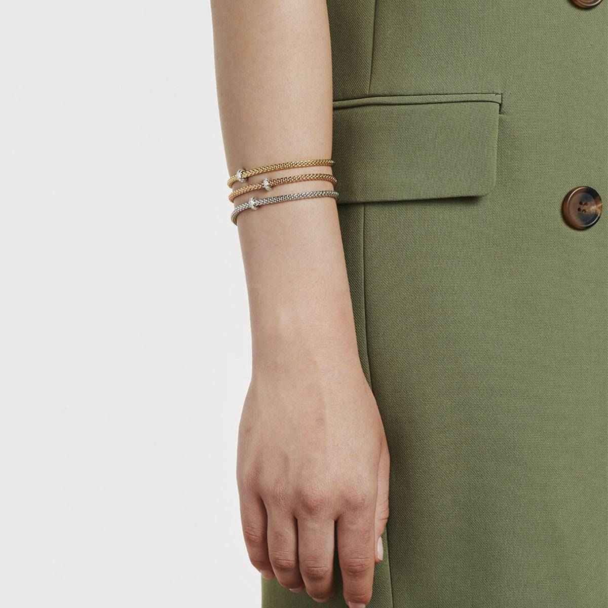 This stunning FOPE bracelet from the Prima Collection is the perfect understated but elegant accessory for everyday or special occasion wear. A versatile design, the bracelet conceals Flex'it small hoops beneath the chain, allowing for a flexible and comfortable fit on the wrist. This version of the Prima Collection bracelet is crafted from 18ct yellow gold, and showcases a single slim rondel to the centre. The rondel boasts a row of round, brilliant-cut diamonds in a pave setting, adding an extra hint of sparkle and glamour. The perfect luxury jewellery gift, this FOPE Prima Collection 18ct yellow gold bracelet with diamonds also comes displayed in genuine branded presentation box.