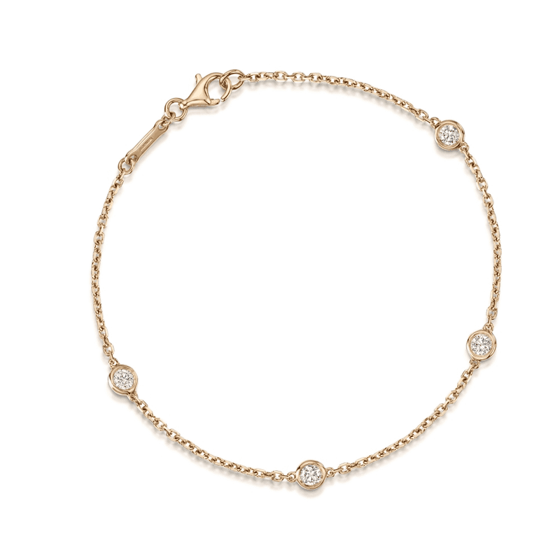Crafted from luxurious 18ct rose gold, this elegant diamond bracelet boasts a selection of carefully chosen diamonds that add panache and finesse to the wrist. The blushing pink tones of this elegant bracelet interact with the fire and brilliance of each diamond to create a stunning finishing touch to any formal or elegant attire. Round brilliant-cut diamonds are secured inside a smooth polished rub-over setting and repeated across the length of the bracelet. The diamonds amount to a total weight of 0.45 carats. The stones chosen have a colour and clarity grading of H and Si.