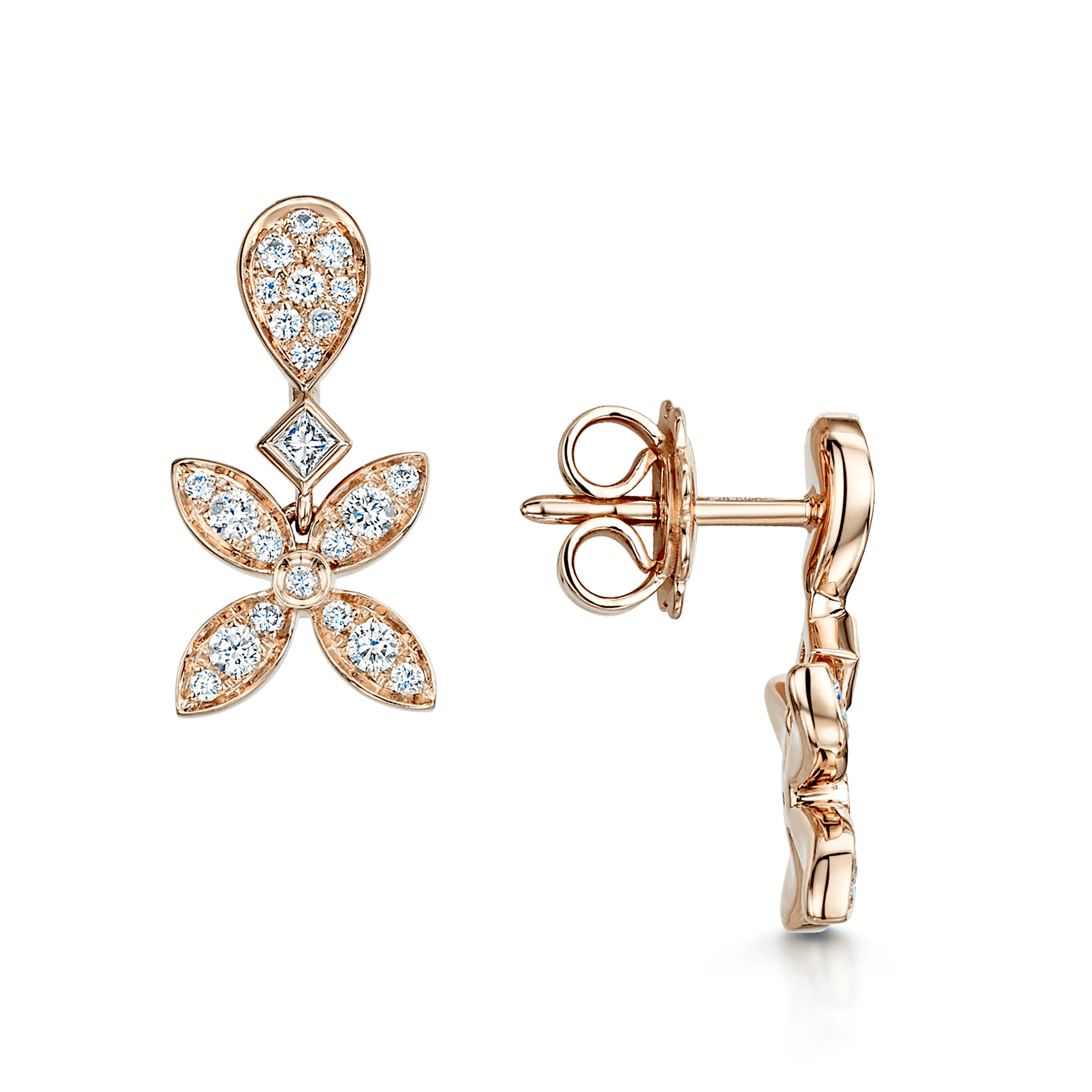 Whether choosing the perfect diamond engagement ring or in search of a gift for a loved one on their birthday, every piece of jewellery showcased in our online collections here at Berry’s Jewellers blends quality materials with a superior selection of diamonds or precious gemstones. These scintillating floral diamond drop earrings are perfect for adding a touch of femininity to any outfit and from an upside-down tear-shaped diamond pave set decoration that attracts the light beautifully. Hanging from this is an off-centre square-shaped diamond pave-set section that connects to a flower section. Four leaves filled with different sized round brilliant-cut diamonds are paved-set into the central section of these petals, forming a delicate flower design. These tones surround a central round brilliant-cut diamond. The earrings are crafted from 18ct rose gold and have been polished to enhance a luxurious finish against each carefully chosen diamond. They attach effortlessly to the ears with a butterfly and post fastening for a secure and comfortable fit against the skin.