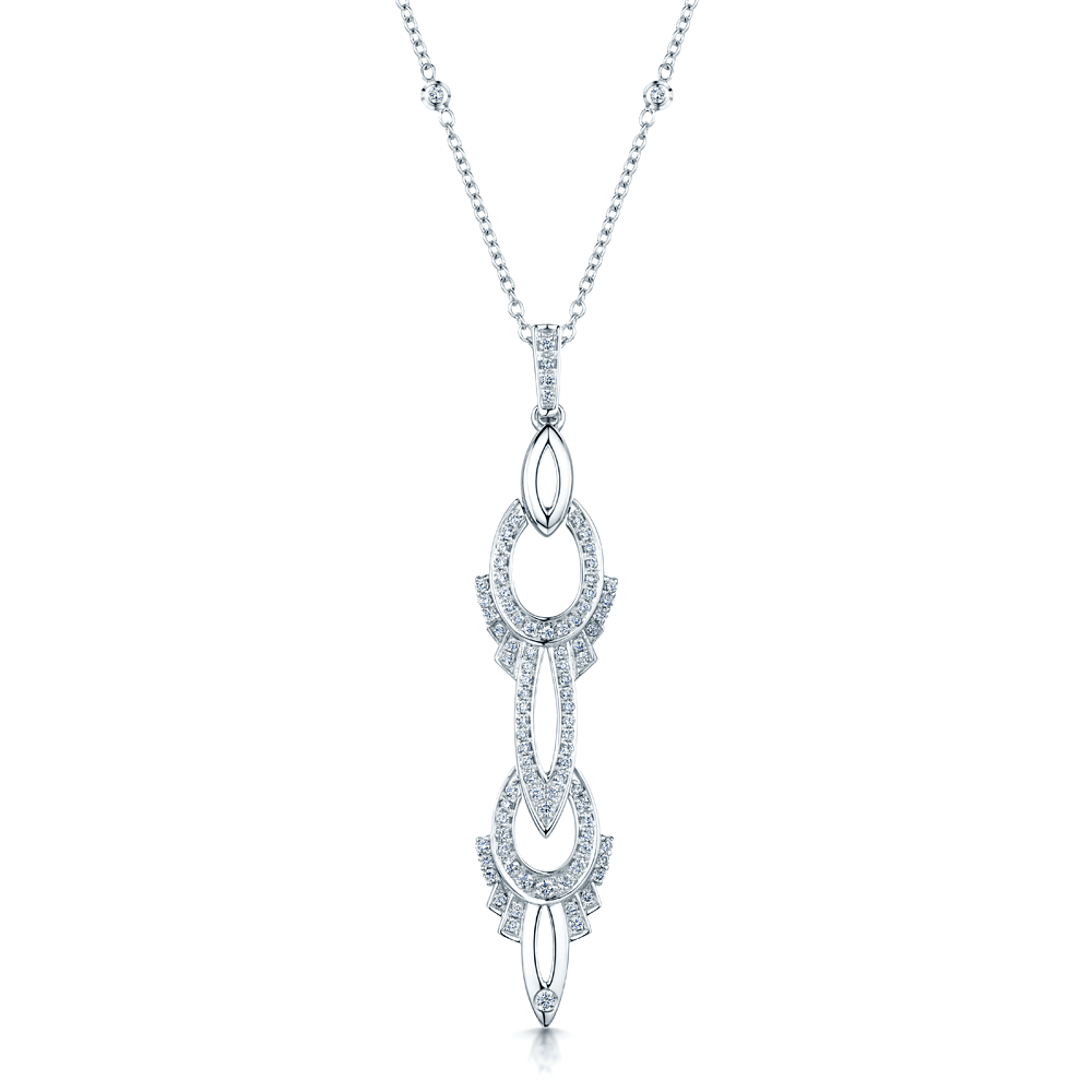 - A stunning white gold diamond Art Deco-inspired pendant from Berry’s Jewellers