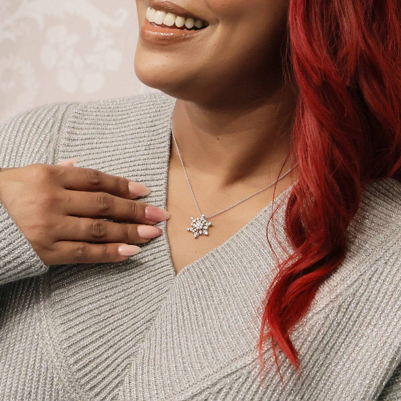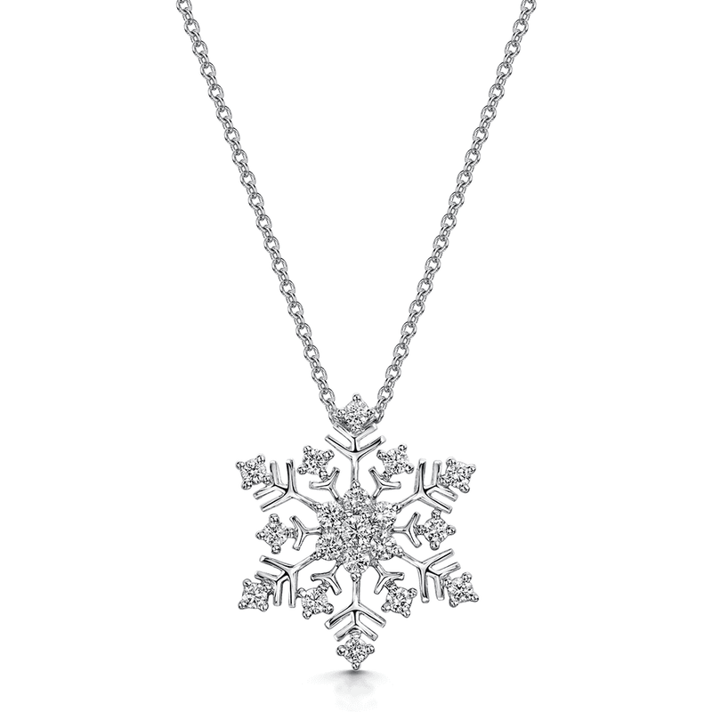 This beautiful snowflake pendant design is crafted entirely from 18ct white gold. Delicate openwork detailing on the frame of the pendant depicts the unique element of each and every snowflake that forms - a symbol of rebirth and purity. The white gold snowflake pendant has been decorated with round brilliant cut diamonds that are scattered onto the points where the intricate patterns connect to one another. As a piece of jewellery to wear to special occasions, this elegantly scintillating diamond snowflake pendant is the perfect addition. The snowflake pendant hangs effortlessly from a matching 18ct white gold chain, securing to the back of the neck with a classic lobster style clasp. The diamonds in this breath-taking beautiful design have been chosen for the unique way in which they reflect flashes of light, creating a mesmerising display of iridescence and radiance. The total diamond weight of this pendant amounts to 0.40 carats.