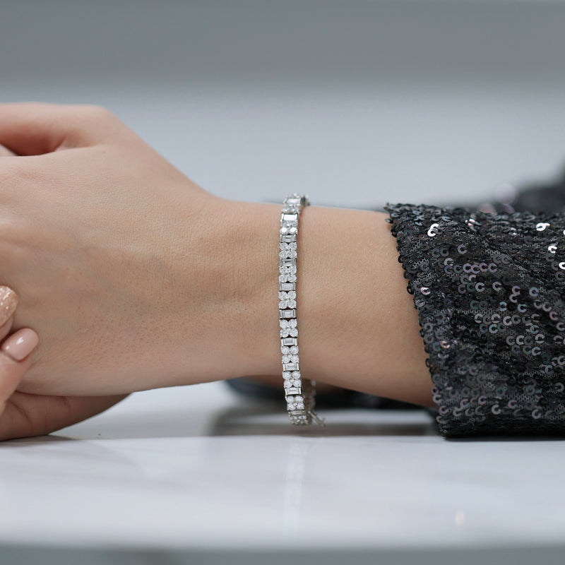 18ct White Gold Round Brilliant And Baguette Cut Diamond Flower Cluster Tennis Bracelet