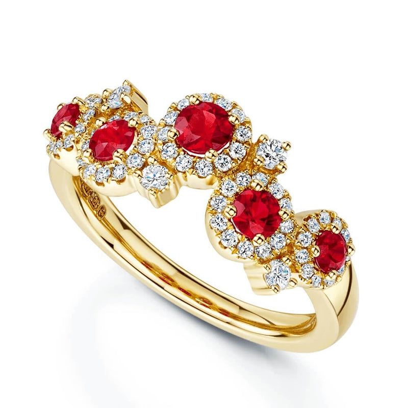 This magnificent round brilliant-cut ruby gemstones are showcased in halo scattered design and diamond ring from Berry’s Jewellers. The design has been crafted from 18ct yellow gold- surface polished to enhance the deep red tones of this popular birthstone for July and the fire and brilliance of each classic diamond. The round ruby stones are each held inside claw settings and surrounded by their own individual halo of delicate round brilliant-cut diamonds that scintillate effortlessly under the light. This stunning ruby and diamond ring comes displayed inside a beautiful Berry’s Jewellers presentation box to complete the perfect gifting experience for a special loved one. The ruby stones selected for this unique ring design amount to a total weight of 0.64 carats. The round brilliant-cut diamonds weigh 0.38 carats.