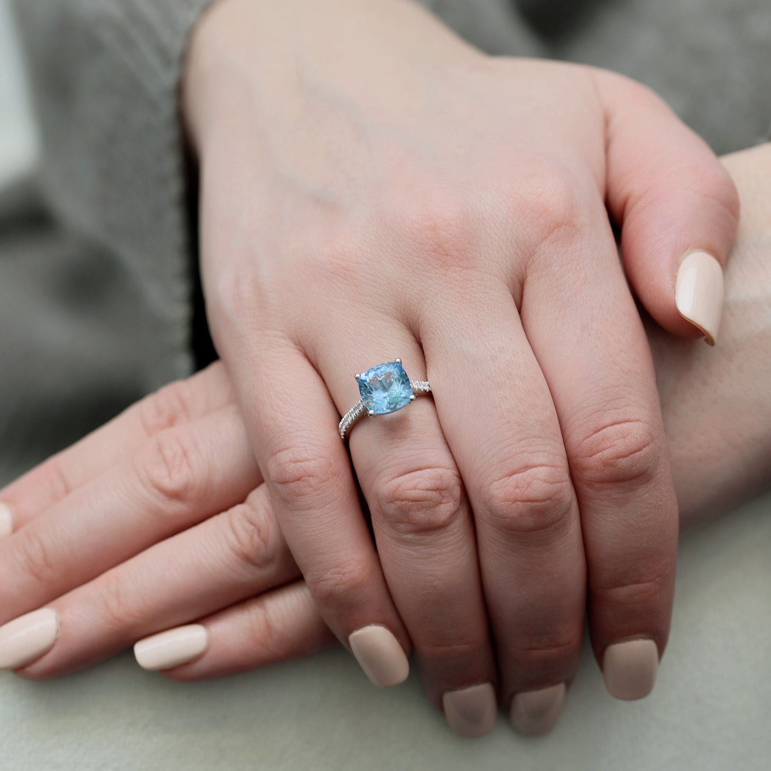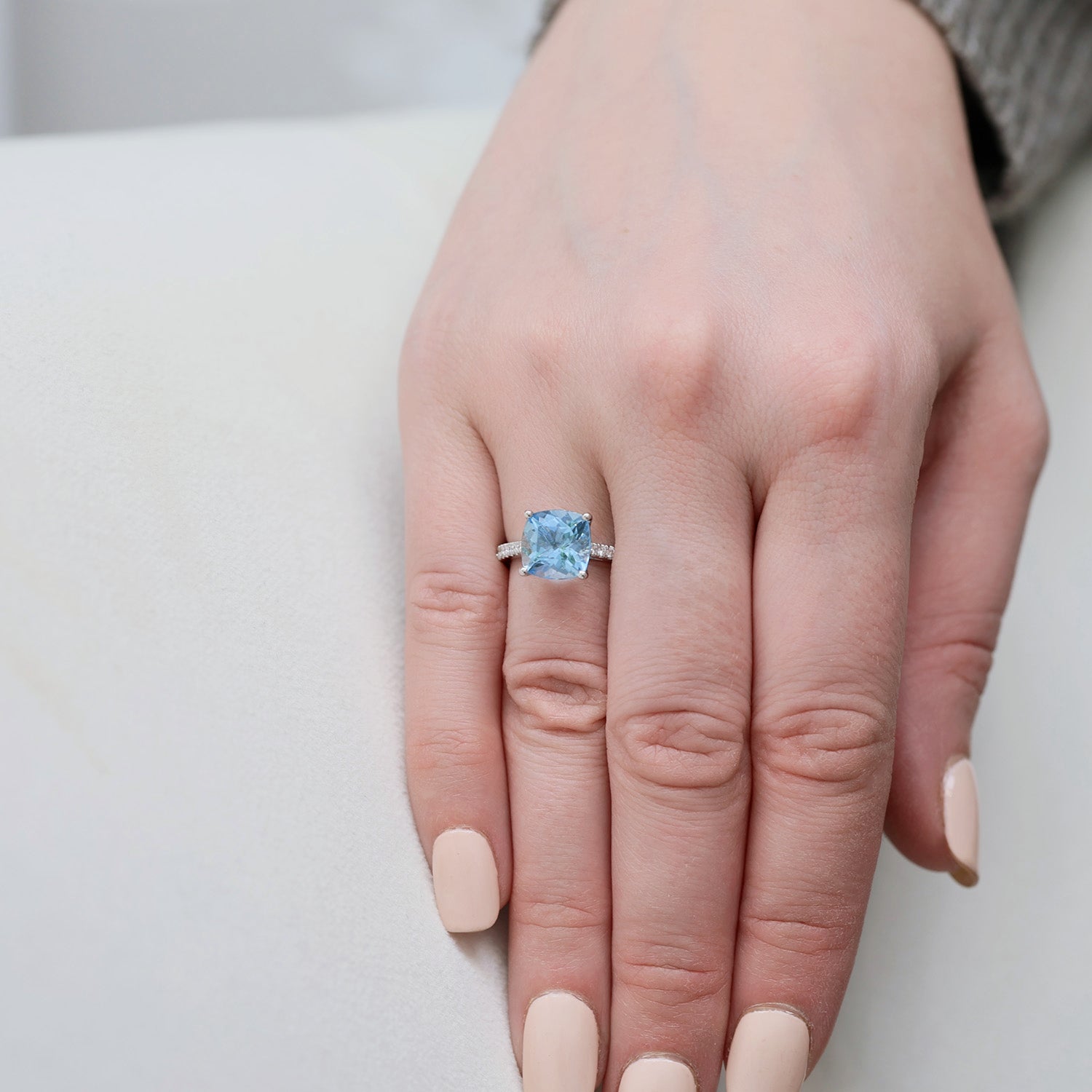 - Featuring a cushion-cut aquamarine gemstone held inside a four-claw setting