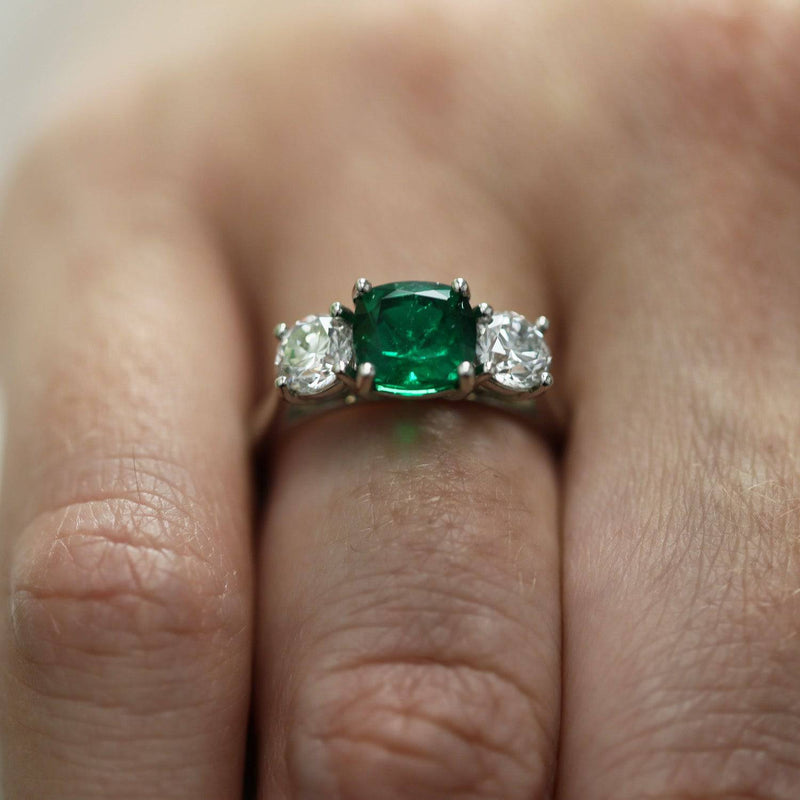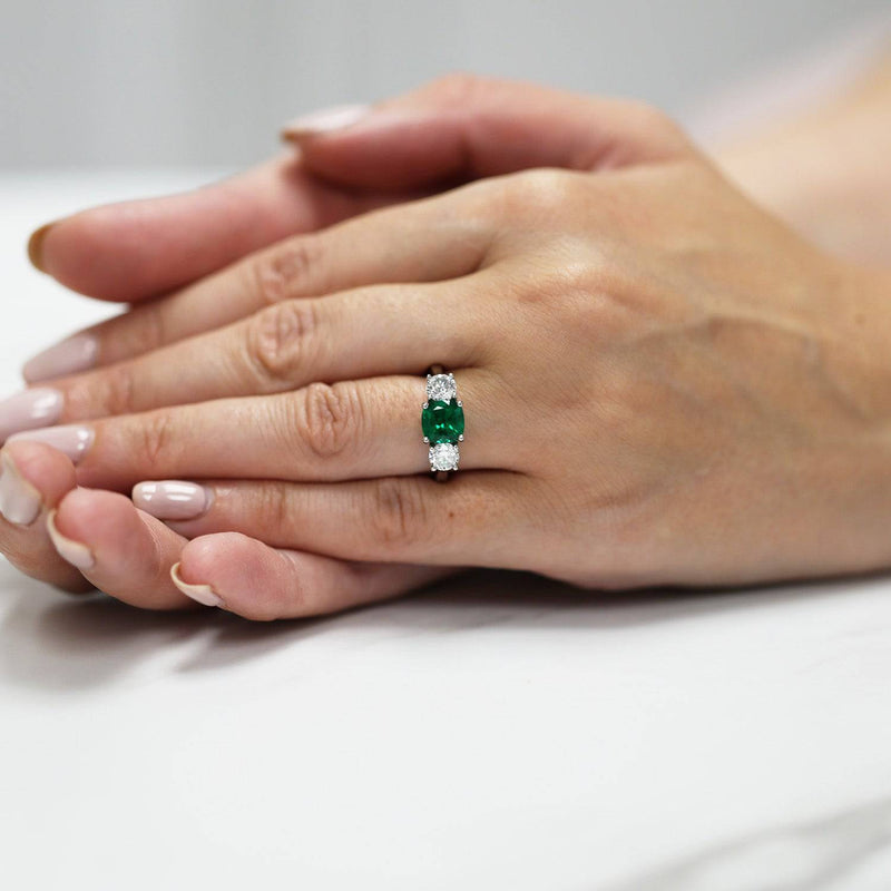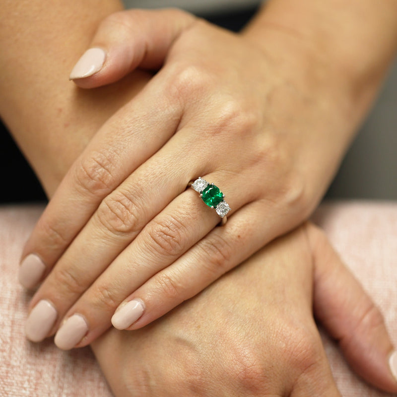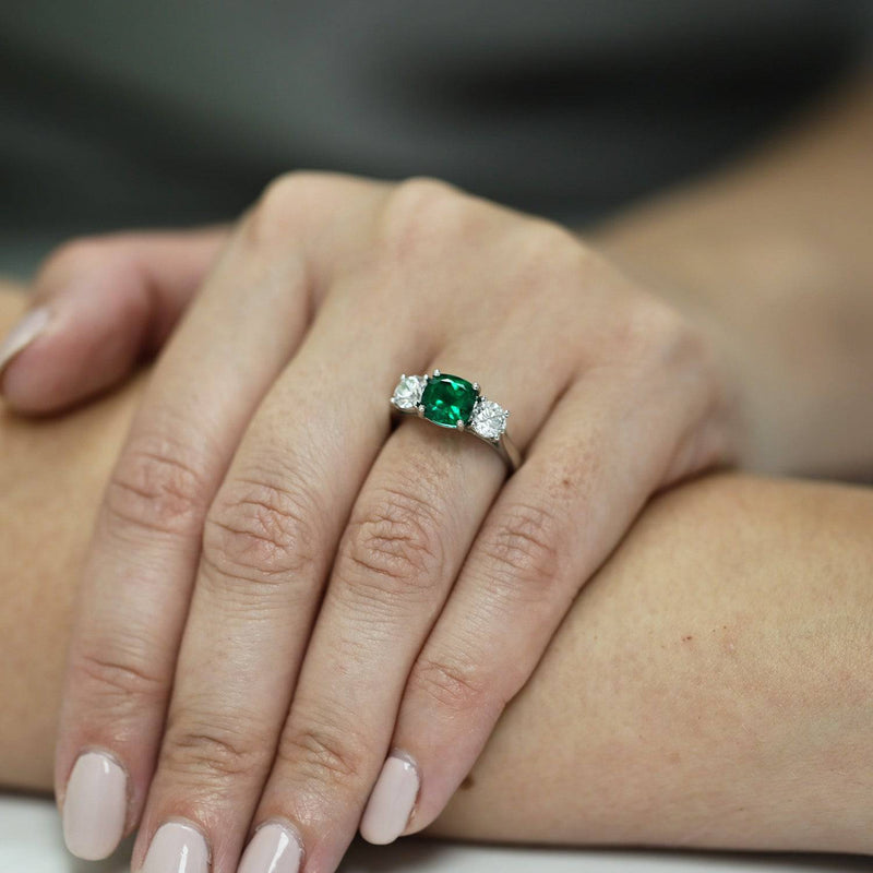 This show-stopping three stone ring from our collections can be worn as an everyday piece of jewellery or saved for those special occasions in life. The ring has been crafted from platinum and features a central cushion cut natural emerald with a round brilliant cut diamond on either side. The emerald gemstone chosen for this stunning ring weighs 1.34 carats and the diamonds amount to a total weight of 1.00 carats.
