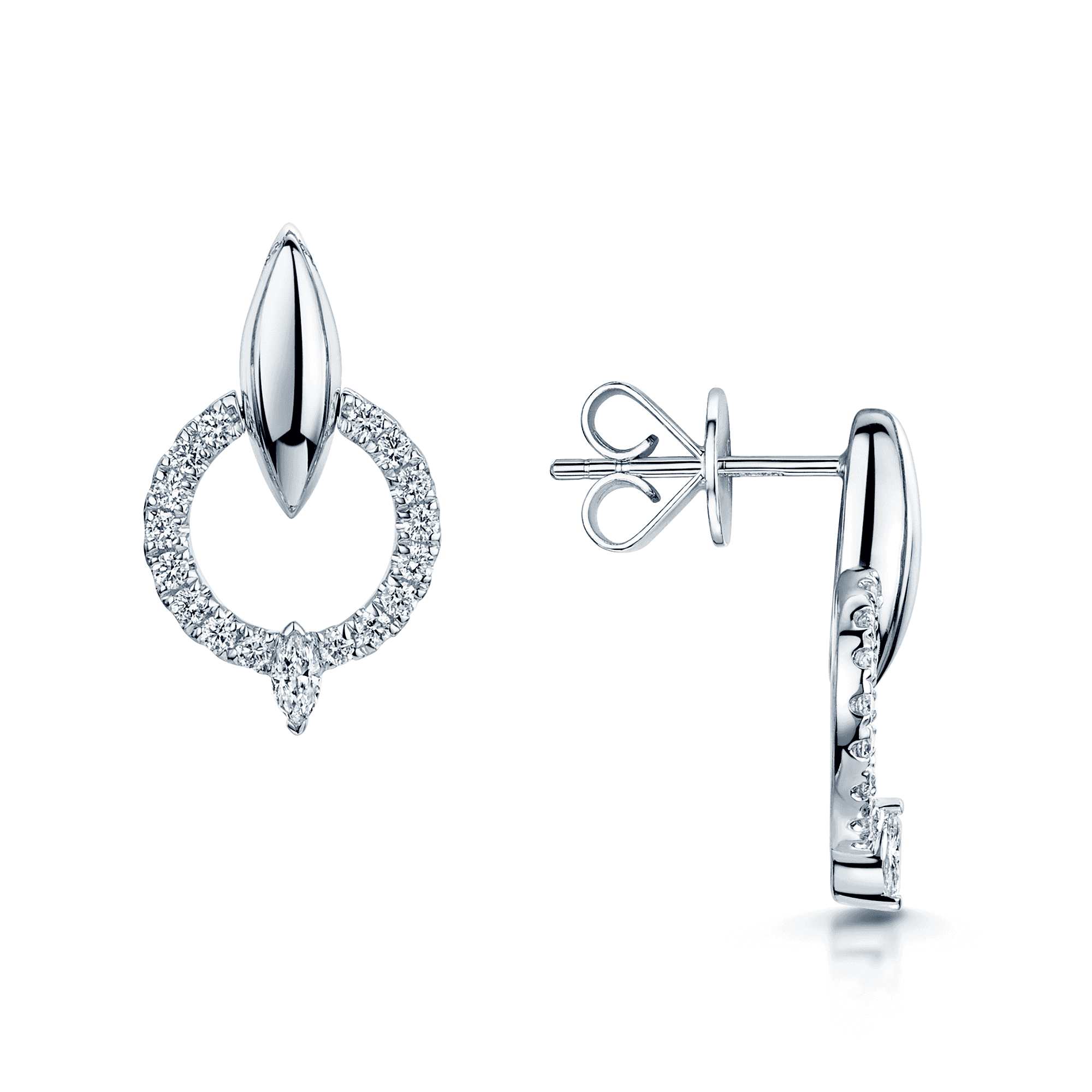 Contrasts in textures, tones and materials make the creations from our exclusive Berry’s Origin collection ideal for enjoying to every occasion in life. In-house designer, Emily Rose based these iconic designs on seed-like profiles and geometric shapes inspired by nature. The tactile designs remain timeless and simple while proving easy to wear. These exquisite Origin earrings have been crafted from lustrous 18ct white gold. The high shine of the smooth flowing metal interacts with the radiance of each diamond incorporated into the design. Each earring Features a polished pod-shaped motif connecting to a pave set round brilliant cut diamond circle drop with marquise diamonds positioned at the base. These Origin earrings secure comfortably to the ears with a classic post and butterfly fasten and can be paired with matching bracelet and necklace pieces from the same collection that echo the design’s organic shapes and fresh style. The length and width of the drop design in each earring measures 20mm by 12mm respectively. The marquise diamonds incorporated into the design amount to a total of 0.11 carats and the round brilliant cut diamonds total 0.37 carats.