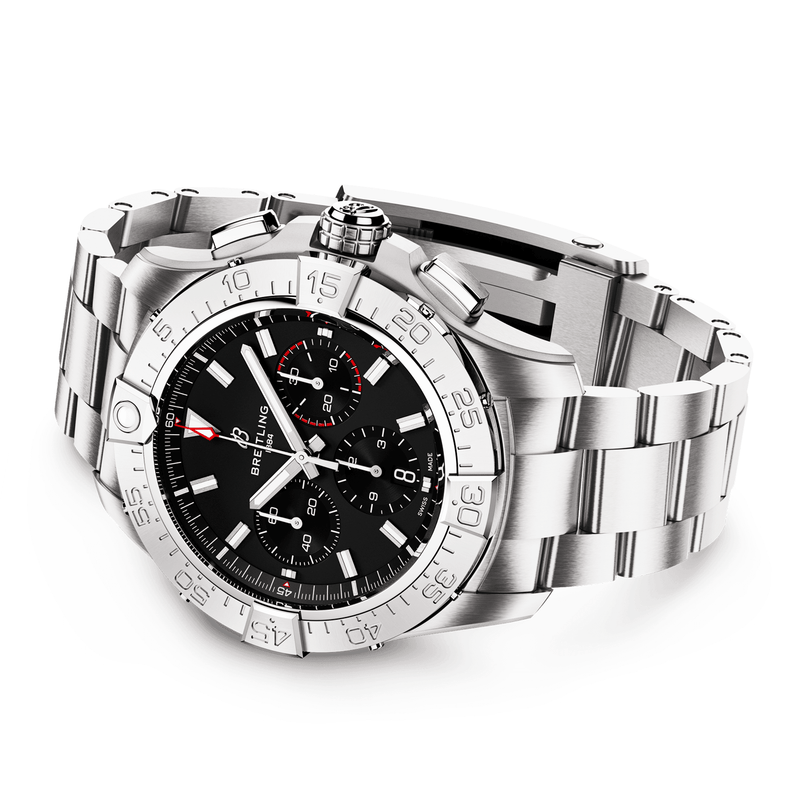 Breitling Avenger 44mm Black Dial Automatic Chronograph Bracelet Watch AB0147101B1A1. Stainless steel 44mm case and bezel all on a matching stainless steel bracelet. This men's watch has a black dial with luminous applied hands and hour indexes, date display at the 6 o'clock position. Water resistant up to 300m and sapphire crystal glass. Power reserve up to 70 hours. Automatic movement.
