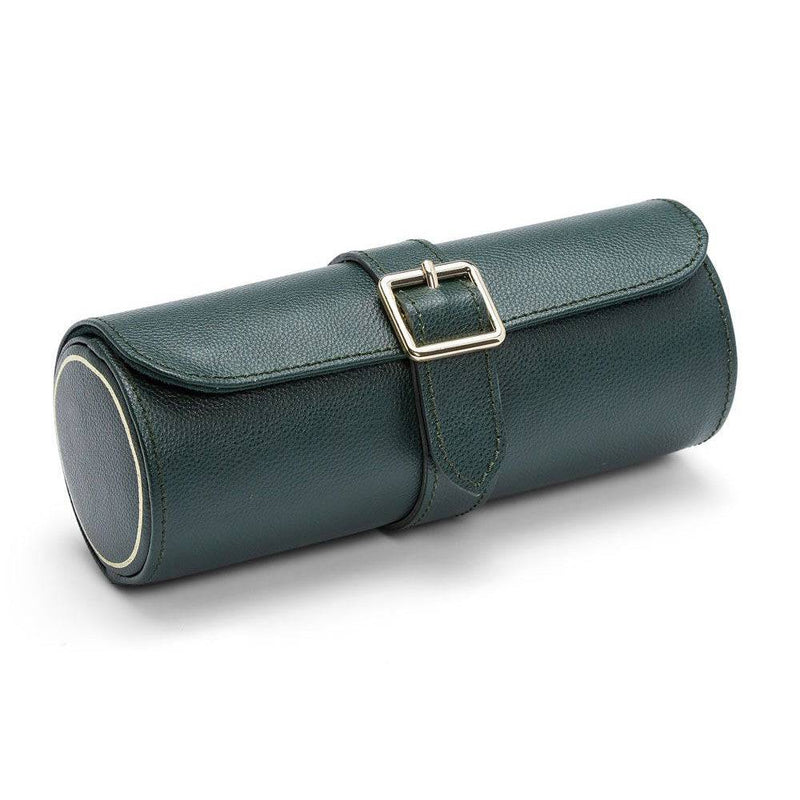 The British Racing Triple Watch Roll from WOLF is designed for the sophisticated traveller who values both style and functionality. This premium watch roll can securely hold up to three watches, featuring a pebble grain leather exterior and a soft suede interior. It's enhanced with a hidden jewellery capsule for additional small treasures like cufflinks or rings. The product is available in green with gold hardware, it also includes two watch guards and an adjustable snap closure, making it a practical yet elegant solution for protecting your precious timepieces on the go.