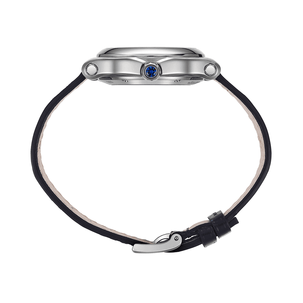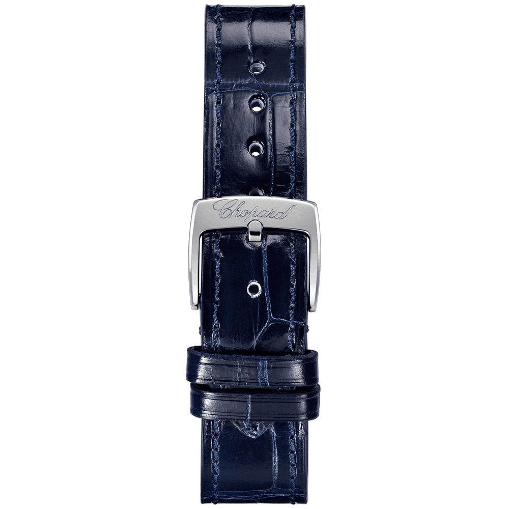 This lady’s Happy Sport watch from Chopard is a distinguishable, playful and creative design that incorporates the prestigious manufacturer’s iconic dancing diamonds concept. A total of five scintillating round brilliant-cut diamonds held inside polished bezel settings are free to roam around inside two transparent sapphire crystal glass panels, catching the light as they roll above the dial’s surface. This automatic lady’s Chopard watch is crafted from stainless steel and measures a diameter of 33mm. Its 30-meter water resistant casing, sealed with a sapphire crystal glass front and back is home to the Chopard 09.01-C self winding movement, which puts on a performance through the exhibition caseback. The silver dial of this lady’s Chopard Happy Sport watch is adorned with traditional tone-on-tone Roman numeral hour markers and slenderly carved hands that taper to a fine point. The watch also Features a railroad minute track around the periphery of the dial and comes completed on a stylish dark blue alligator leather strap with a solid stainless steel pin buckle fastening to complete its classic look.