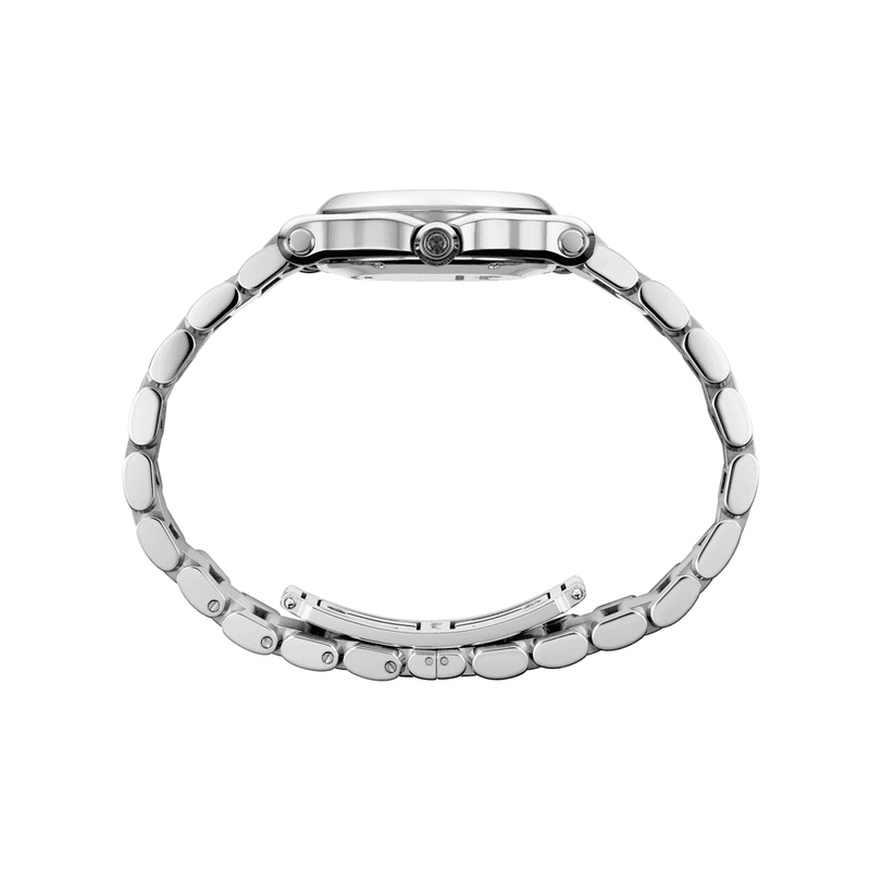 Stainless steel 30mm rounded case and bezel, all featured on a matching steel bracelet with folding clasp. This ladies watch has a light blue dial with Roman numeral quarters and three floating diamonds. Scratch resistant sapphire crystal glass and water resistant up to a total of 30 metres. Quartz movement.