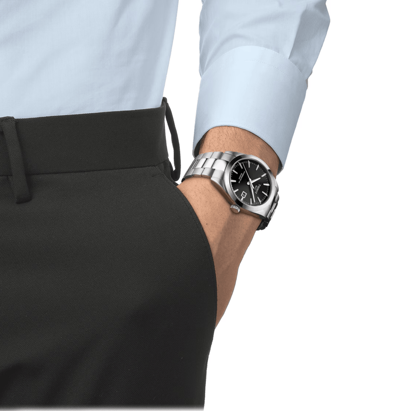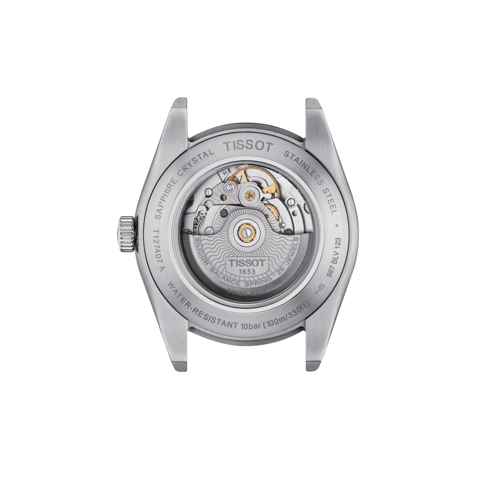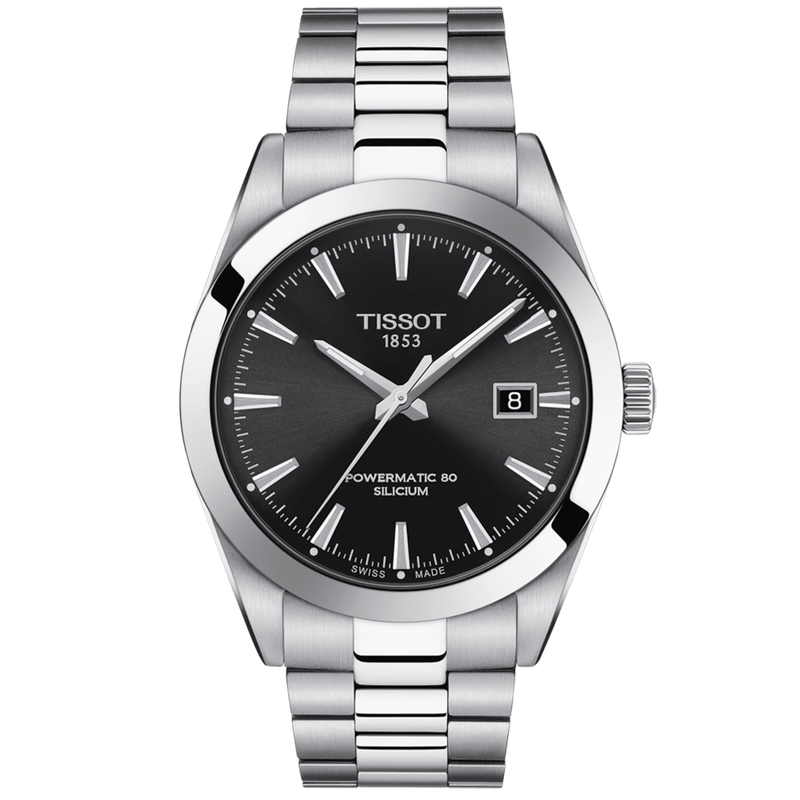 Tissot Gentleman Powermatic 80 Ice Blue Dial Bracelet Watch - T1274071105100. Stainless steel 40mm rounded case and bezel, all featured on a matching steel bracelet with butterfly clasp and push-piece opening mechanism. This men's watch has a black dial with baton indexes, as well as a date display at the 3 O'clock position. Scratch resistant sapphire crystal glass and water resistant up to a total of 100 metres. Tissot Powermatic 80 automatic movement with 80 hours of power reserve.