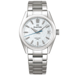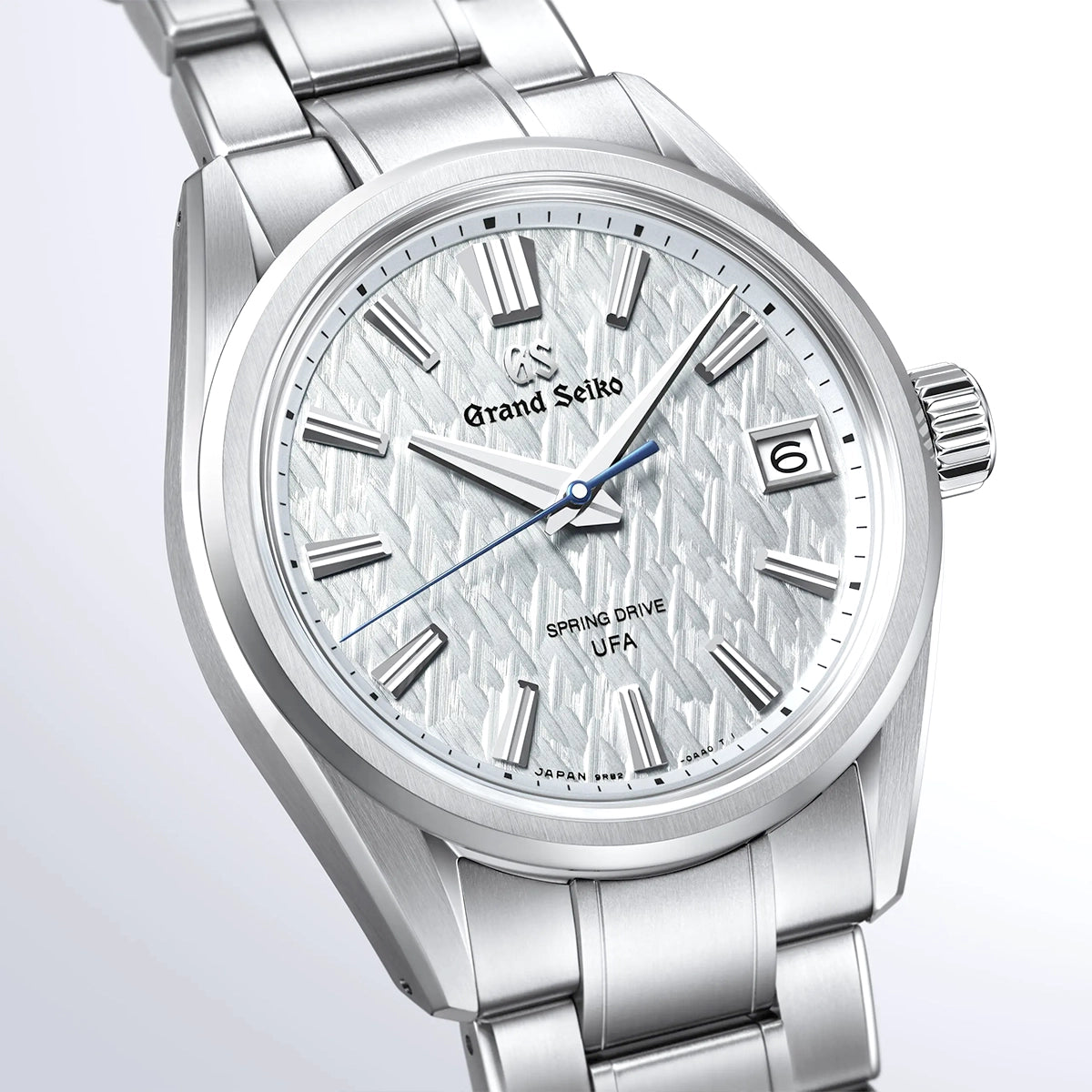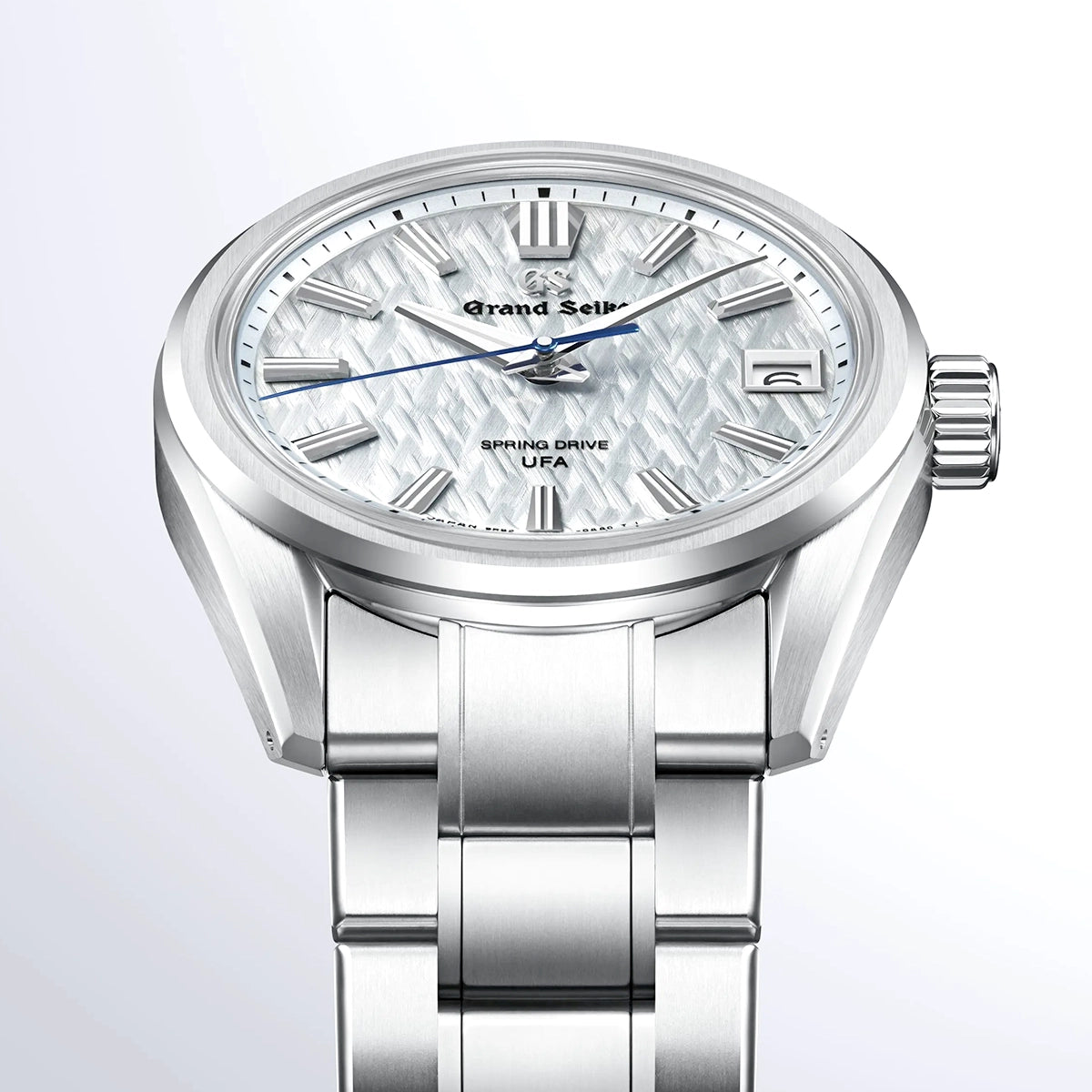 Grand Seiko Evolution 9 'Ice Forest' UFA Spring-Drive Mens Bracelet Watch SLGB003. High-intensity titanium 37mm case and bezel all on a matching titanium bracelet. This men's watch has a textured light blue/silvery dial with polished hands and hour indexes, date display at the 3 o'clock position inspired by the silvery blue forest of the Kirigamine Highlands. Sapphire crystal glass. Spring-Drive calibre 9RB2 'Ultra Fine Accuracy' movement.
