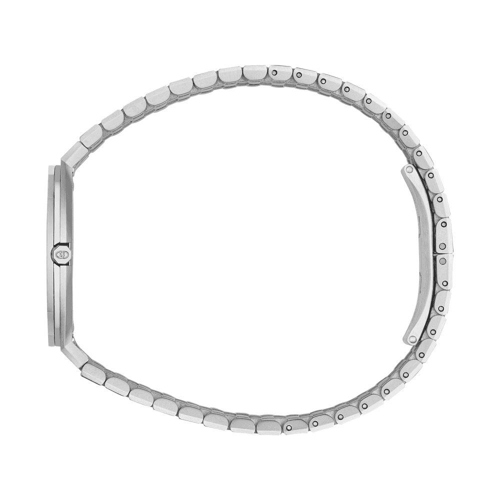 The 25H watch collection by Gucci represents a new direction for the Italian brand. It symbolises its debut into high-end watchmaking whilst also reflecting on the company’s success as a fashion house for an entire century. The 30mm Gucci 25H watch is designed for the female wrist, offering a compact and manageable streamlined case crafted from stainless steel. The top of the case is sealed with anti reflective sapphire crystal glass, which protects the surface of a silver-coloured dial from scratching, heat damage, moisture, denting and dust. The Gucci watch boasts plenty of retro charm and Features a multi-layered case that houses a quartz-powered movement at its centre. The 30-meter water resistant Gucci watch for ladies also Features the Interlocking G motif which pays homage to a particularly symbolic talisman. The wristwatch Features an hour track represented by stick hour markers, surrounded by a scintillating bezel set with round brilliant-cut diamonds. The watch completes its retro look with a five-link stainless steel bracelet that encloses comfortable with a robust folding clasp.
