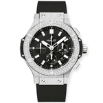 The daring and powerful Hublot Big Bang watch, adorned in diamonds is a luxury watch forged from superior materials. Hublot chooses 316L stainless steel for the body of this case. A material chosen for its corrosion resistant and tough properties - its lustrous polished finish creating the perfect setting for a diamond-encrusted bezel. The broad 44mm companion boasts a total of 114 round brilliant-cut diamonds that amount to a total weight of 1.70 carats. In addition to this, the Big Bang’s unmistakable bezel is also completed with 6 H-shaped titanium screws. The dial of the Big Bang steel watch is presented in matte black tones and equipped with a small second dial at 9 o’clock, a 30-minute counter at 3 o’clock and a 12-hour scale at 6 o’clock. The chunky central hands and baton markers are coated in luminous material to assist with timekeeping during the night and a discreet date aperture can be found at 4:30. The HUB4100 self-winding movement that beats at the heart of this steel case is equipped with a useful 42-hour power reserve. To complete the stylish look of the men’s Hublot Big Bang Steel Diamonds watch, a black lined rubber strap folds over the wrist with a matching stainless steel deployment clasp.