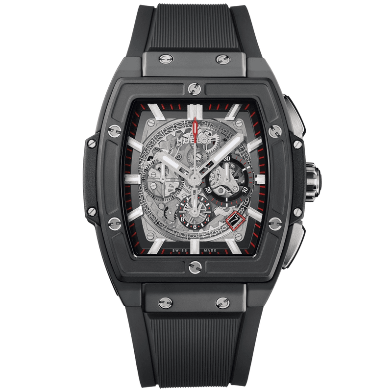 The Hublot Spirit of Big Bang Black Magic watch is a sleek and stealth-like tool that promises chronograph functions combined with reliable timekeeping. The model has been crafted from black micro-blasted ceramic and has been integrated with 100-meter water resistant. The top of the case Features a scratch resistant and anti reflective sapphire crystal glass, along with a micro-blasted black ceramic bezel adorned with 6 H-shaped titanium screws. The chronograph watch for men by Hublot measures a 45mm diameter and Features a sapphire dial with a 30-minute counter, a small second counter and a 12-hour totaliser, along with a legible date window at 4:30. The men’s Hublot Spirit of Big Bang Black Magic watch houses the in-house HUB 4700 calibre inside its robust casing, capable of producing a 50-hour power reserve. A shot of red can be seen amongst the dial’s luminous central hour and minute hands and a legible baton hour track. The men’s Hublot Spirit of Big Bang Black Magic watch is completed on a sporty black structured and lined rubber strap, securing with a black-plated titanium deployment clasp.