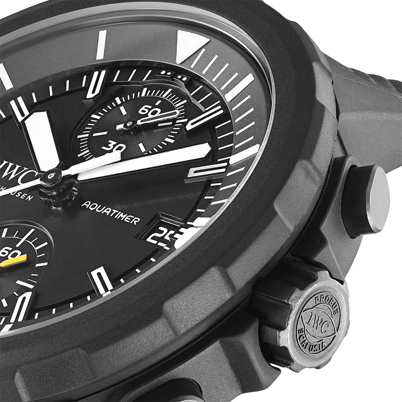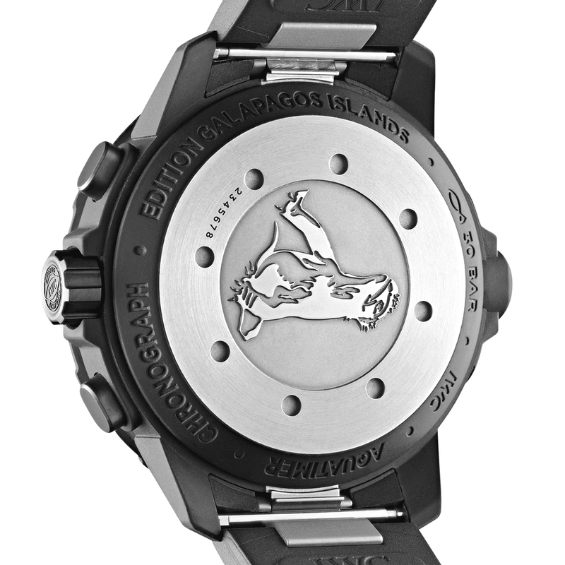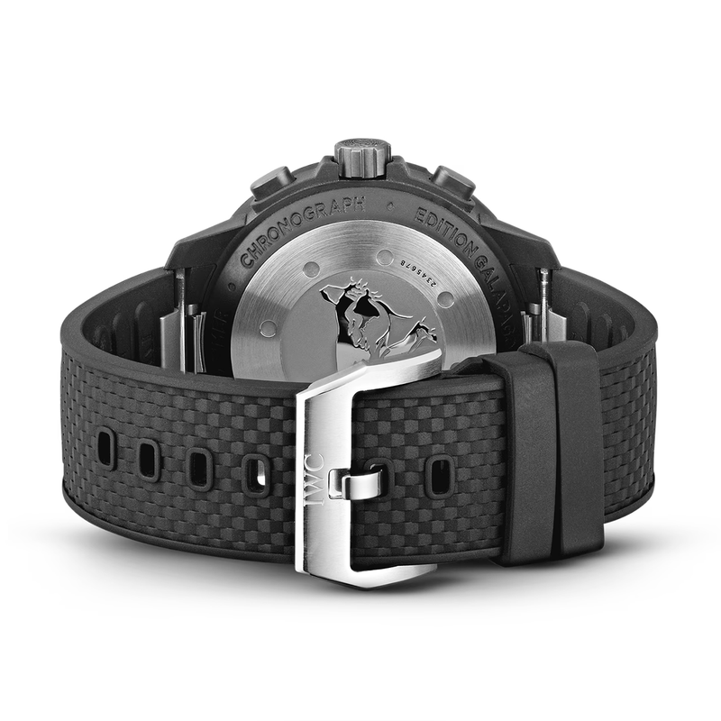 IWC Aquatimer 45mm "Galapagos Islands" Edition Chronograph Watch IW379502. Black vulcanised rubber 45mm case and rotating inner/outer bezel with SafeDive system all on black rubber strap. This men's watch has a black dial with luminous applied hands and hour markers as well as a date/day display at the 3 o'clock position. Special edition engraved caseback. Sapphire crystal glass and water resistant up to 300m. 68 hour power reserve. Automatic chronograph movement.