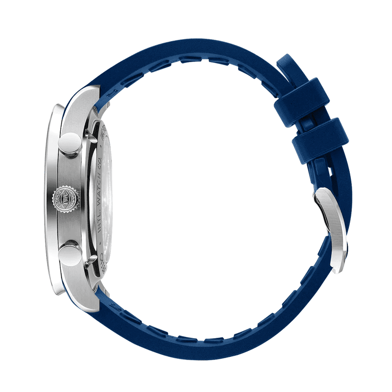 IWC Portugieser Chronograph White/Blue Dial Men's Automatic Watch IW371620. Stainless steel 41mm case and bezel all on a blue rubber strap. This men's watch has a white dial with blued hands, hour numerals and sub dials. Water resistant up to 30m and sapphire crystal glass. Power reserve up to 46 hours. Automatic chronograph movement.