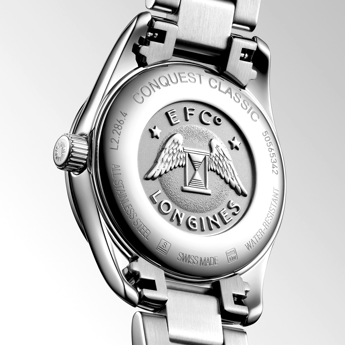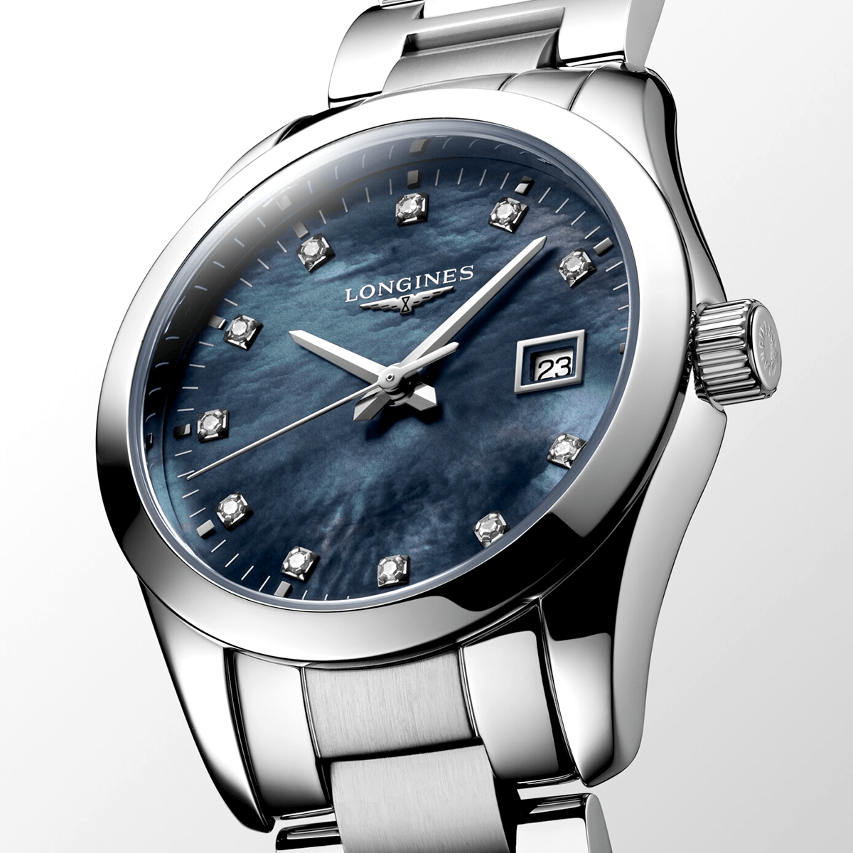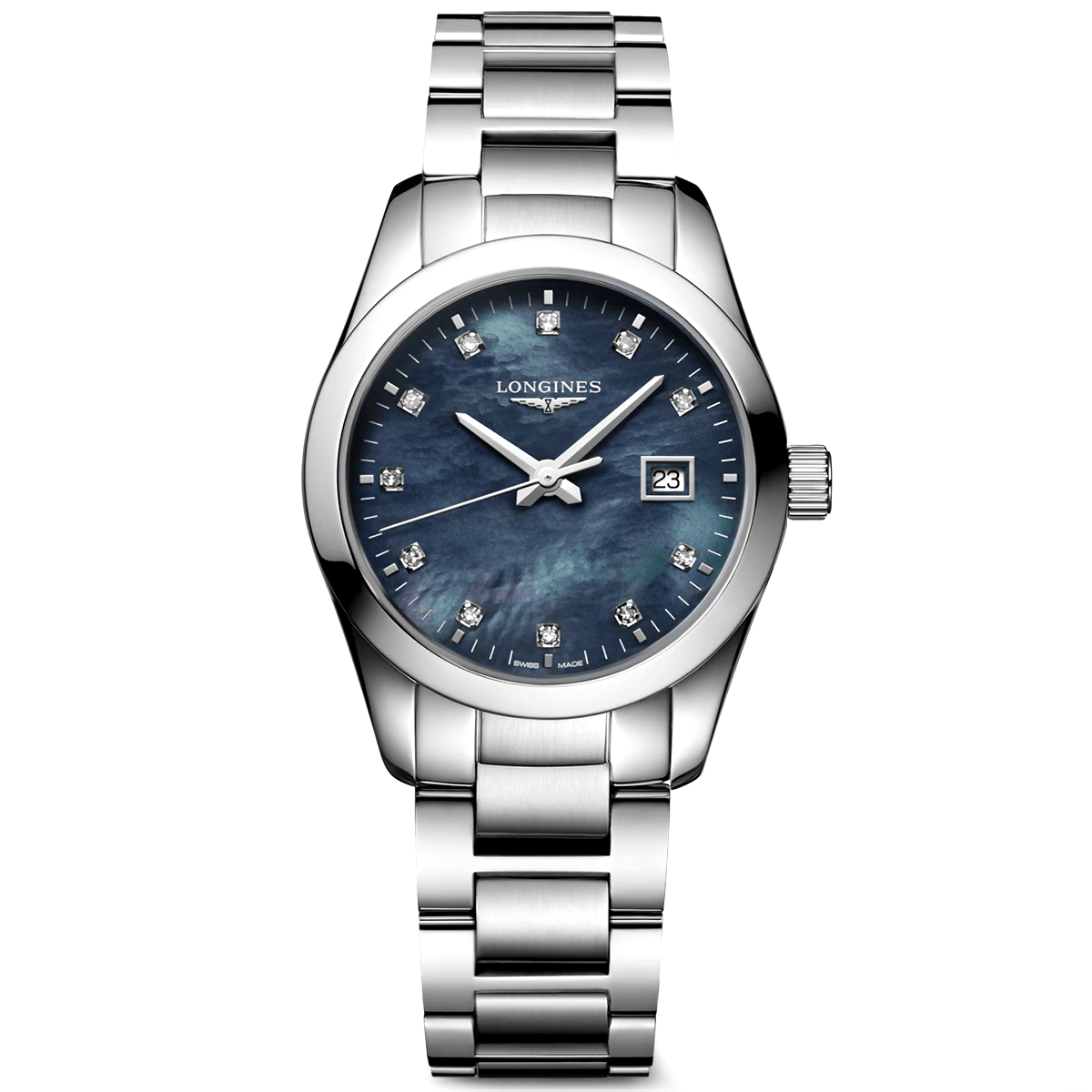 The Conquest Classic line by Longines is a tribute to the brand’s sporting elegance. This timepiece, measuring a 29.5mm diameter is crafted from stainless steel and topped with an anti reflective sapphire crystal glass front that protects a sumptuous black mother of pearl dial. The hour locations are represented by scintillating diamond dot indexes for an indulgent and luxurious feel on the wrist. This lady’s Longines Conquest watch bears the Longines lettering and winged hourglass logo at 12 o’clock, as well as white date aperture at 3 o’clock. The 30-meter water resistant model is executed on a brushed stainless steel bracelet with a triple folding clasp and push-piece opening mechanism. Inside the robust yet elegant case of this lady’s Longines Conquest Classic watch is a reliable Swiss-made quartz movement for guaranteeing uncompromised reliability all day and all night.