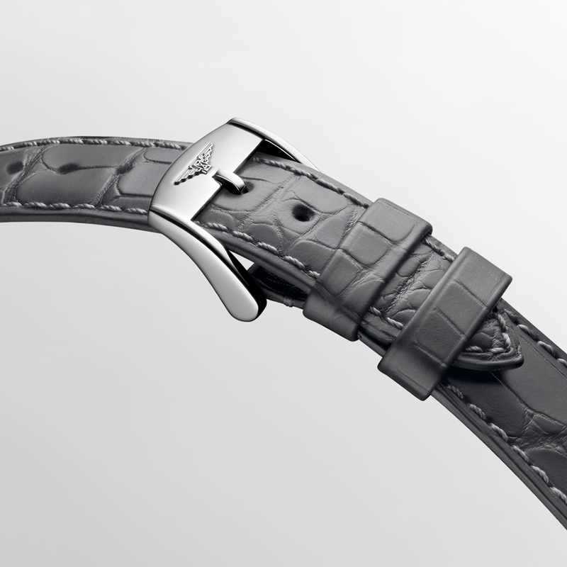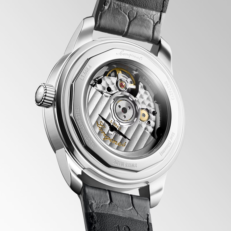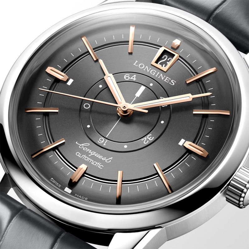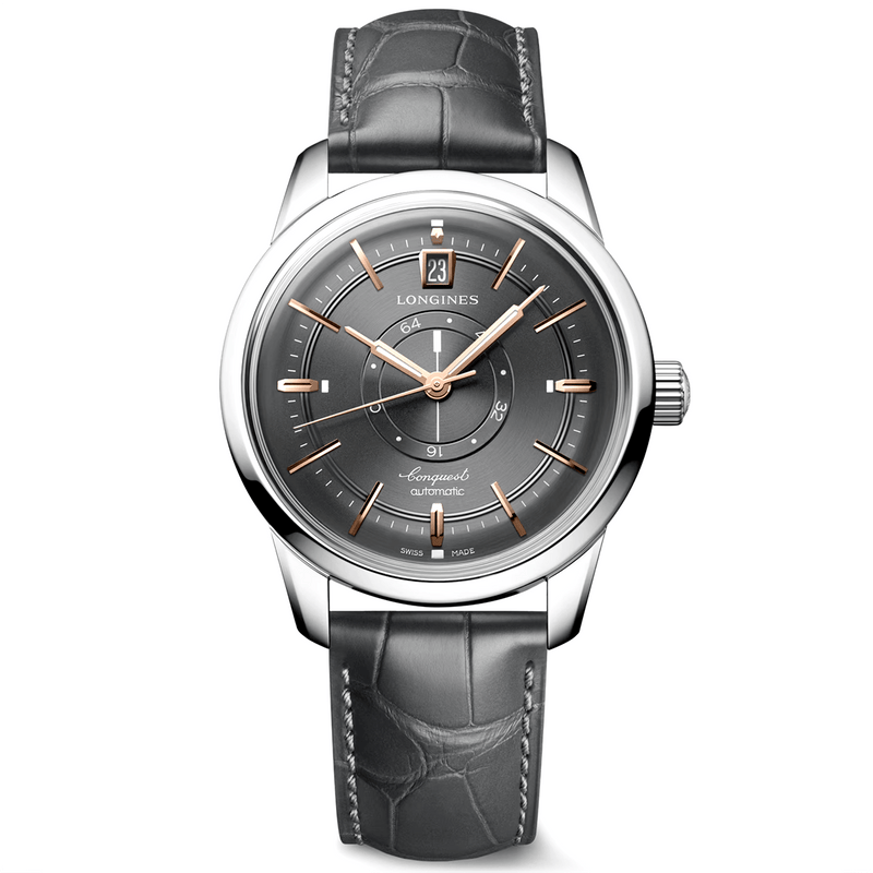 Longines Conquest Heritage Central Power Reserve 38mm Grey/Rose Dial Watch L16484622. Stainless steel 38mm rounded case and bezel, all featured on a grey leather strap. This watch has a grey sunray dial with rose golden hands and hour indexes, date display at the 12 o'clock position and central power reserve display. Scratch resistant sapphire crystal glass, and water resistant up to a total of 100 metres. Automatic L896.5 calibre with up to 72 hours of power reserve.