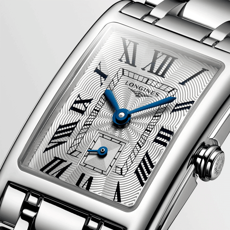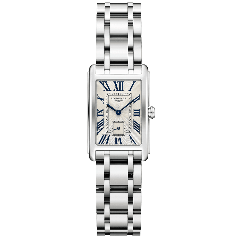 Longines watches for women from the DolceVita collection demonstrate contemporary elegance with their rectangular-shaped cases and softly rounded corners. This beautiful stainless steel lady’s Longines DolceVita watch is integrated with 30-meter water resistance and measures dimensions of 20.80 X 32.00 mm. Its Features a sapphire crystal glass front with anti reflective properties. The glass lens protects the dial from dust, denting, light, heat and moisture. The dial of this lady’s Longines DolceVita watch is executed in a silver flinque finish with blued steel hands and crisp black painted Roman numeral hour markers. A small second sub-dial is located at 6 o’clock and the dial also Features a legible inner minute track. Inside the case of this women’s Longines watch is a reliable Swiss-made quartz movement for guaranteeing uncompromised accuracy. The watch is completed on a stainless steel bracelet with a triple folding clasp and a push-button opening mechanism.