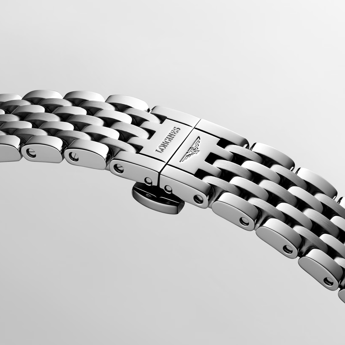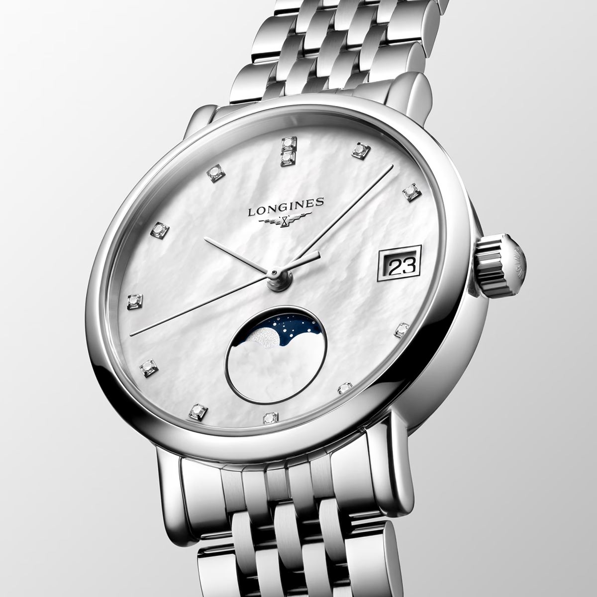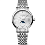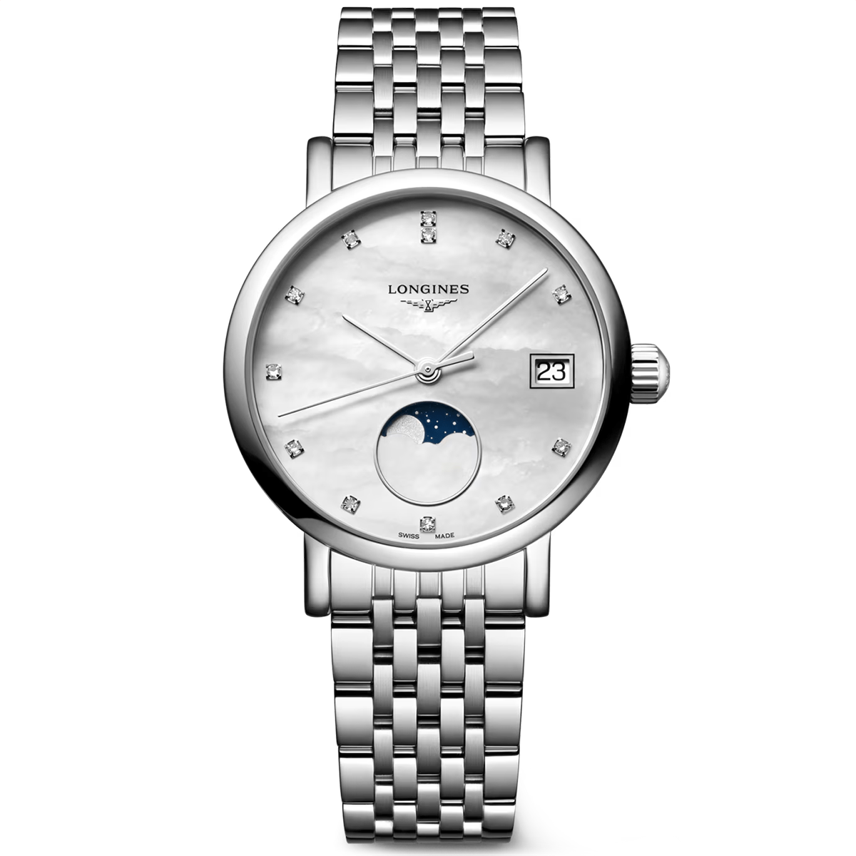 Longines Elegant Moonphase 30mm White Mother of Pearl Dial Bracelet Watch L43304876. Stainless steel 30mm rounded case and bezel, all featured on a matching stainless steel bracelet. This watch has an white mother of pearl dial with 11 diamond set markers, as well as a date display at the 3 o'clock position. Scratch resistant sapphire crystal glass and water resistant up to a total of 30m metres. L296 quartz movement.