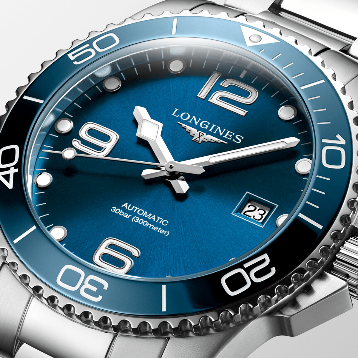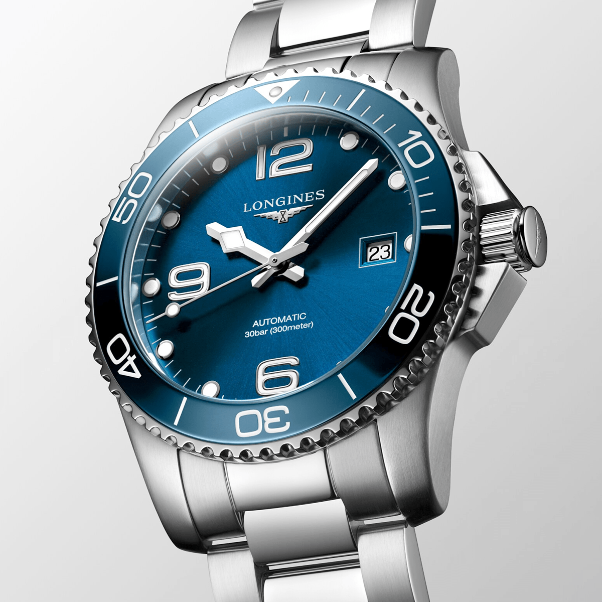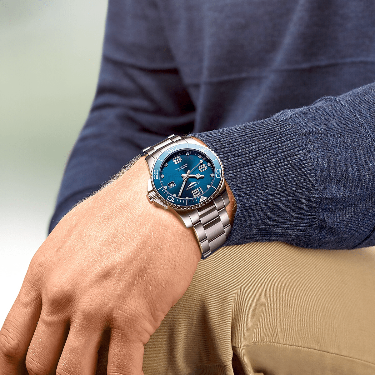 Built to last and characterised by the stealth of its performance, the Hydroconquest watch is dedicated to those looking for a high-performance watch for challenges on both land and underwater. This 41mm men’s Longines watch is crafted from stainless steel and conveys its ruggedly masculine style through a chiselled physique. The top of the watch’s 300-meter water resistant case is topped with a unidirectional rotating bezel in blue to match its dial. The bezel Features a 60-minute dive scale for measuring elapsed time whilst exploring underwater depths The entire surface of the Hydroconquest watch’s captivating sunray blue dial is protected by an anti reflective and scratch resistant sapphire crystal glass lens. A screw-down crown and caseback engraved with the winged hourglass logo assist the watch with upholding its water resistance capability. In addition to a clear date window at 3 o’clock, the dial of this men’s Longines Hydroconquest watch Features Super-LumiNova-coated hands and Arabic numerals at 12, 6 and 9 o’clock. The Longines dive watch is fitted with a robust stainless steel link bracelet, equipped with a double safety folding clasp and a diving extension facility for wearing over the top of a wetsuit.