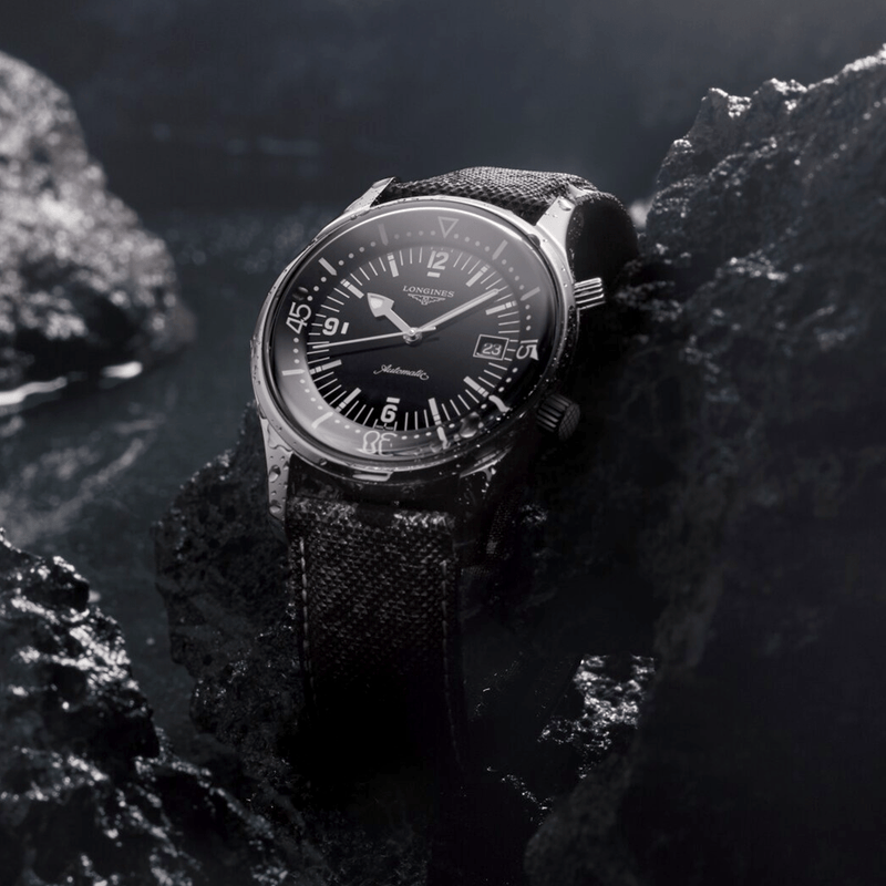 The Legend Diver watch from Longines conveys a very distinct vintage edge whilst still offering all the modern Features expected of a luxury dive watch. The model measures a 42mm diameter on the wrist and has been crafted from stainless steel. Upon the surface of the caseback is an image of a diver, accompanied by the watch’s unique serial number. The black dial of this Longines Legend Diver watch Features vintage-coloured Super-LumiNova material adorned to the stick hour markers and the legible minute dashes. These combine with a luminous minute hand and arrow-tipped hour hand. Painted Arabic numerals are also displayed at 12, 6 and 9 o’clock, accompanied by a date window at 3 o’clock. This Longines Legend Diver watch is powered by the automatic Calibre L888, which provides a 72-hour power reserve and performs at a rate of 25,200 vibrations per hour. It sits inside a 300-meter water resistant case equipped with a screw-down crown to lock an internal turning diving flange. The watch comes fitted on a comfortable black leather strap with a stainless steel buckle engraved with the iconic Longines logo.