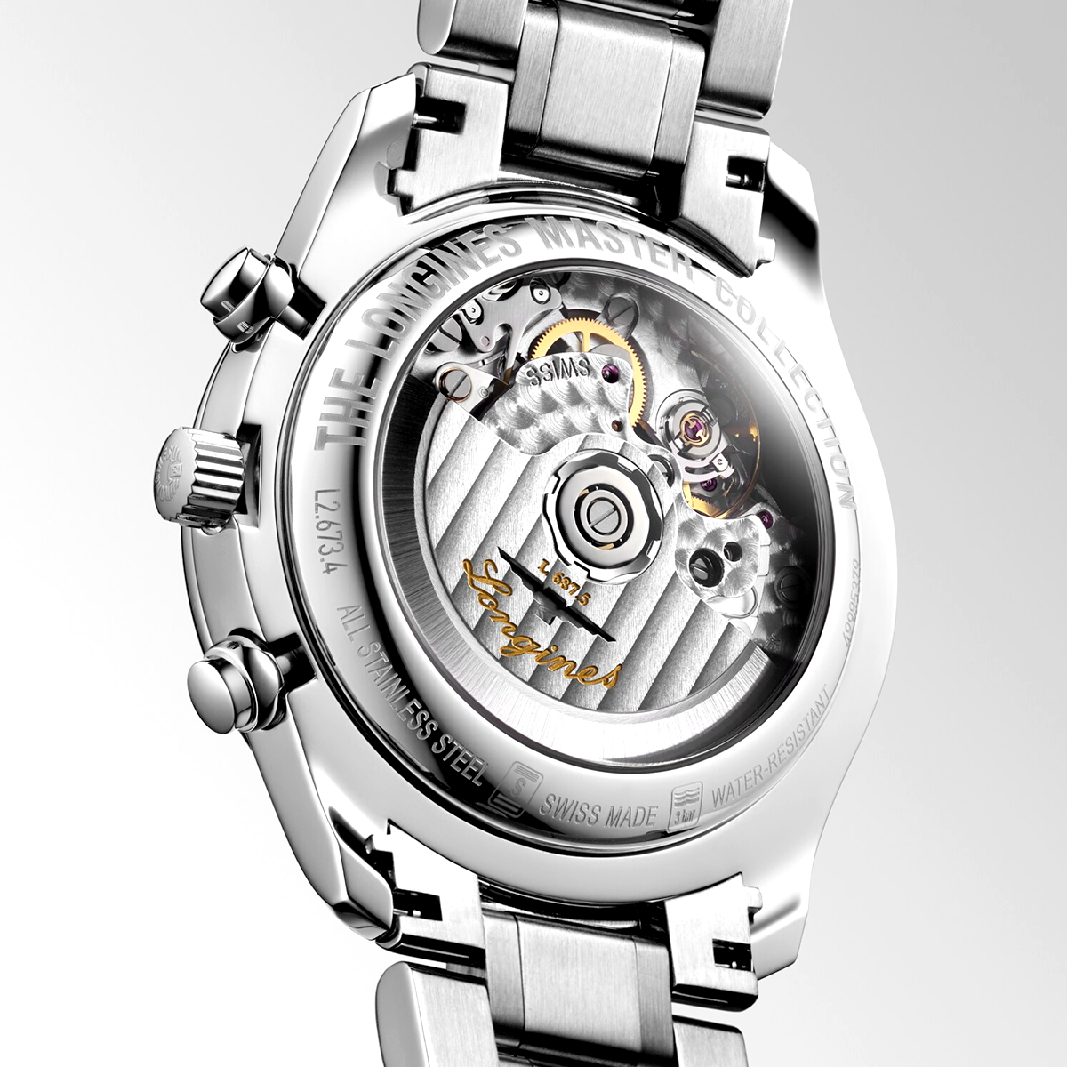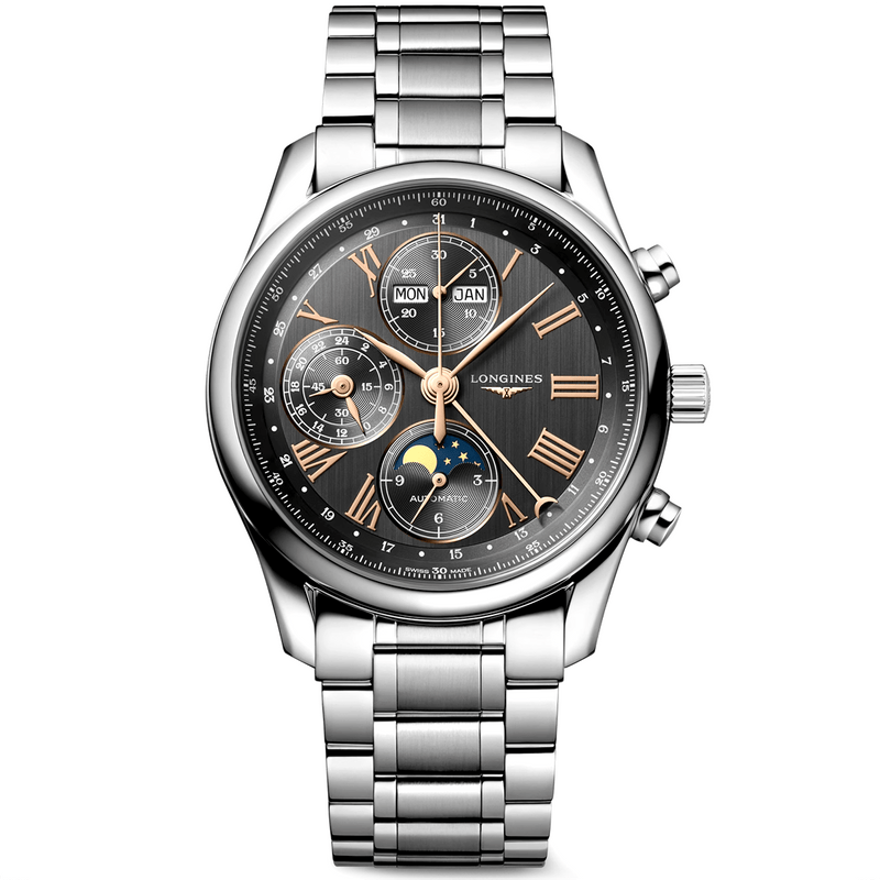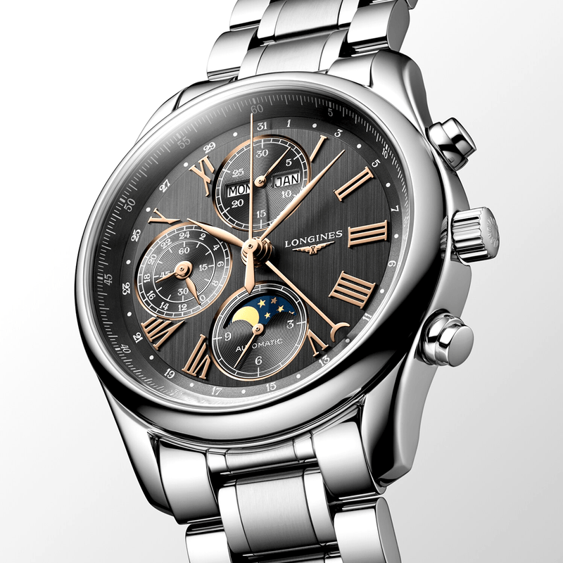 Longines Master Collection Chronograph Calendar 40mm Grey Dial Bracelet Watch L26734616. Stainless steel 40mm rounded case and bezel, all featured on a grey alligator strap. This men's watch has an anthracite dial with a date, day, month & moonphase displays set across the dial. Sapphire crystal glass and water resistant up to a total of 30 metres. L687 automatic movement with 66 hours of power reserve.