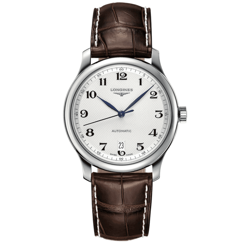 The Longines Master Collection presents this elegant dress watch for men, measuring a compact 38.5mm diameter. The stainless steel model Features a perfectly rounded case fitted with a scratch resistant and anti reflective sapphire crystal glass front. The strong glass protects the surface of the dial from denting, scratching, moisture, heat and light damage. Underneath this glass lens is a silver barleycorn dial adorned with crisp black Arabic numeral hour markers. A set of blued steel central hands exude a classic finish to this dial, along with a date window at 6 o’clock, balanced by the Longines name and winged hourglass logo at 12 o’clock. This men’s Longines Master Collection watch is powered by the automatic Calibre L888. The reliable self-winding engine beats at a rhythm of 25,200 vibrations per hour and provides a useful 70-hour power reserve. Enabling for the watch to be worn with elegant or casual attire alike, this Master Collection watch from Longines is completed on a brown alligator leather strap and a stainless steel triple folding clasp.