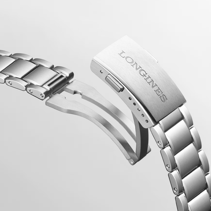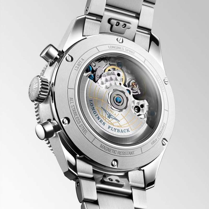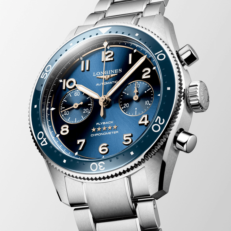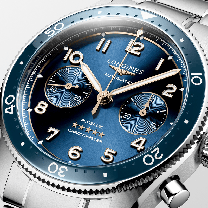 Longines Spirit Flyback 42mm Blue Dial Men's Automatic Chronograph Watch L38214936 Stainless steel 42mm rounded case and bi-directional blue ceramic bezel, all featured on a matching steel bracelet. This men's watch has a sunray blue dial with Arabic numeral hour markers and hands coated with Super-LumiNova, two chronograph counters and flyback chronograph function. Scratch resistant sapphire crystal glass and water resistant up to a total of 100 metres. Automatic L791.4 COSC certified movement with 68 hours of power reserve.