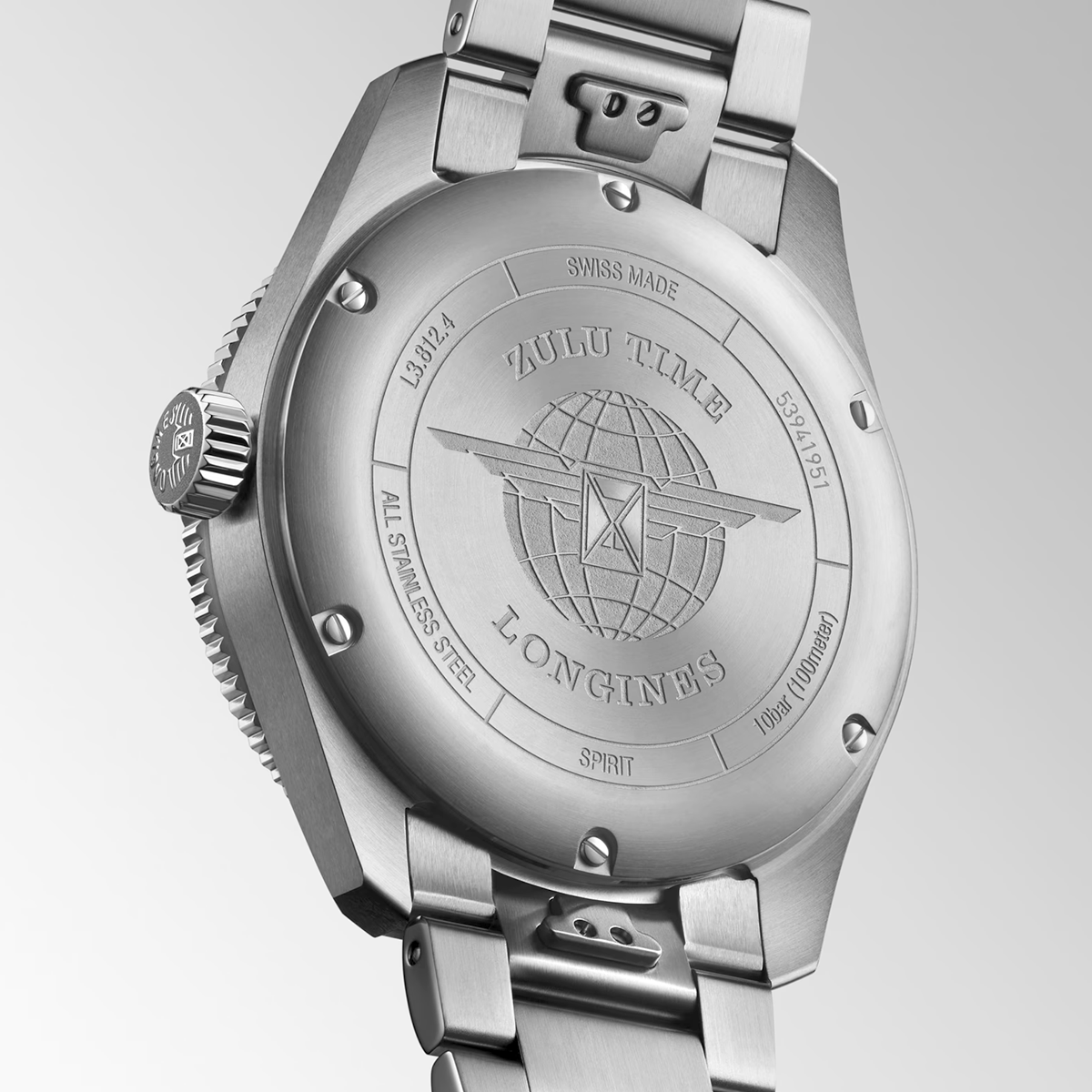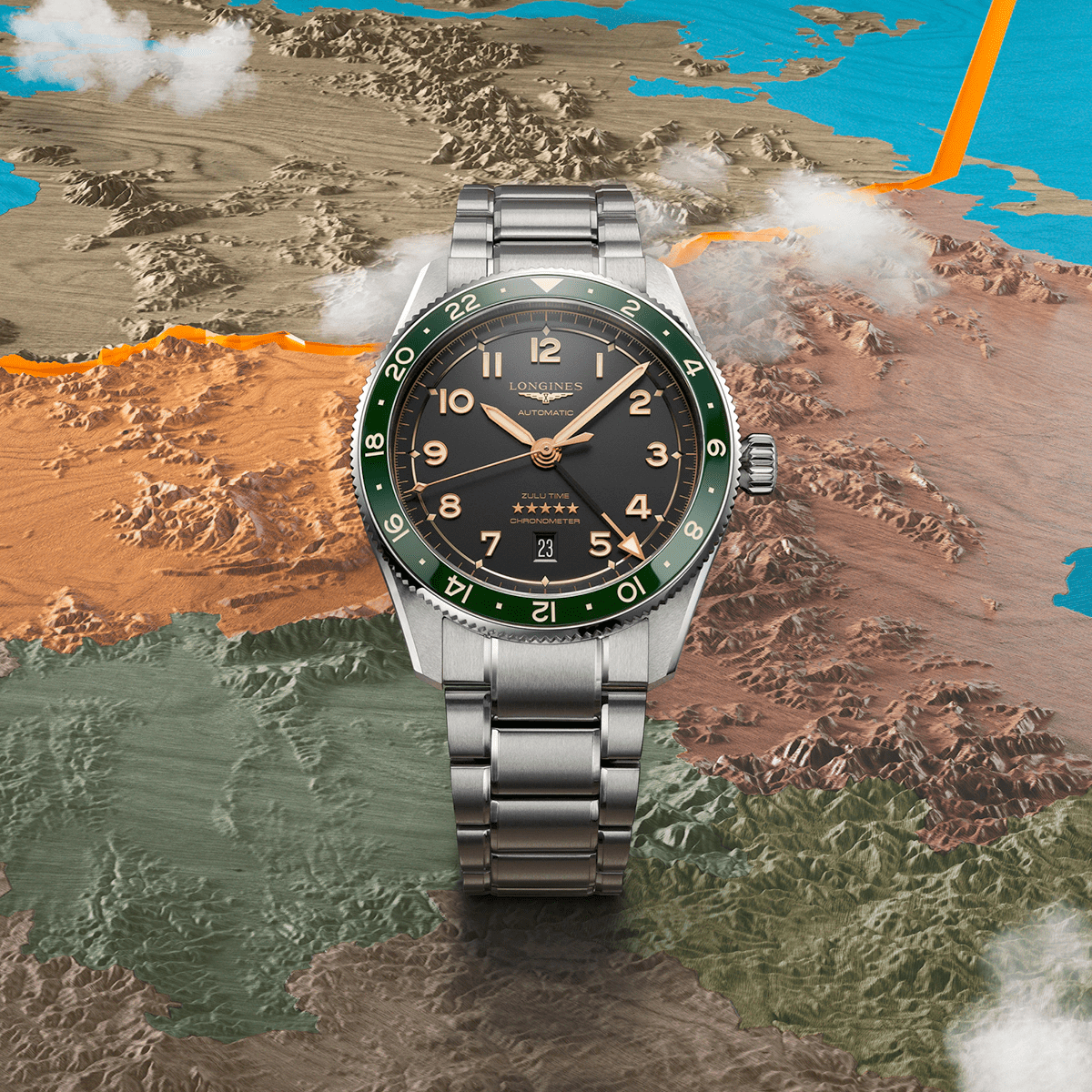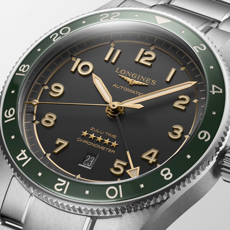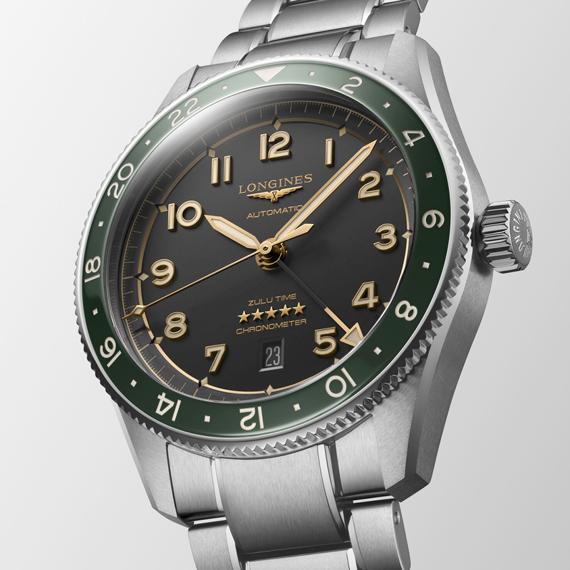 Longines Spirit Zulu Time 42mm Anthracite Dial & Green Bezel Bracelet Watch L38124636. Stainless steel 42mm rounded case and ceramic bezel, all featured on a matching steel bracelet with folding clasp. This men's watch has a anthracite dial with Arabic numerals coated with Swiss Super-LumiNova, as well as a GMT hand for a second time zone and also a date display at the 6 O'clock position. Scratch resistant sapphire crystal glass and water resistant up to a total of 100 metres. L844.4 automatic movement with 72 hours of power reserve.