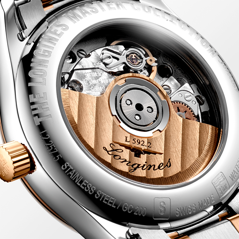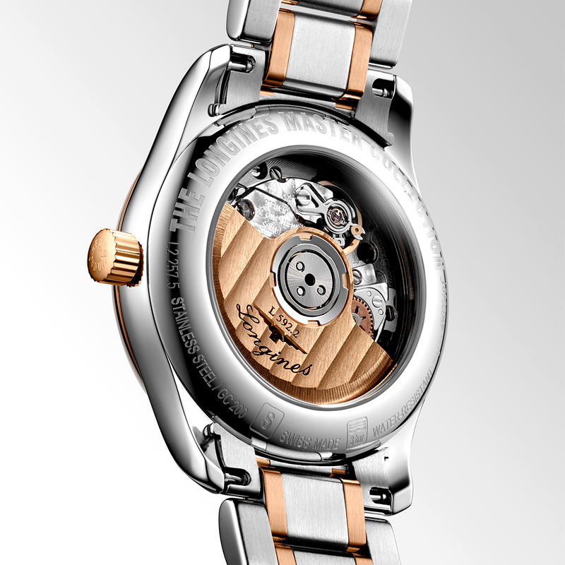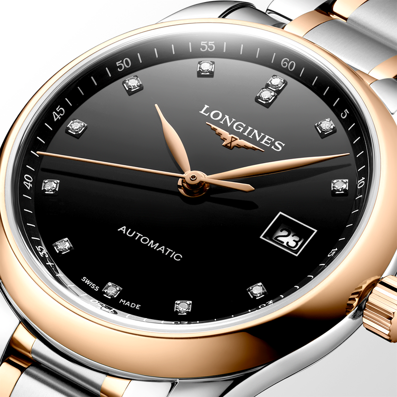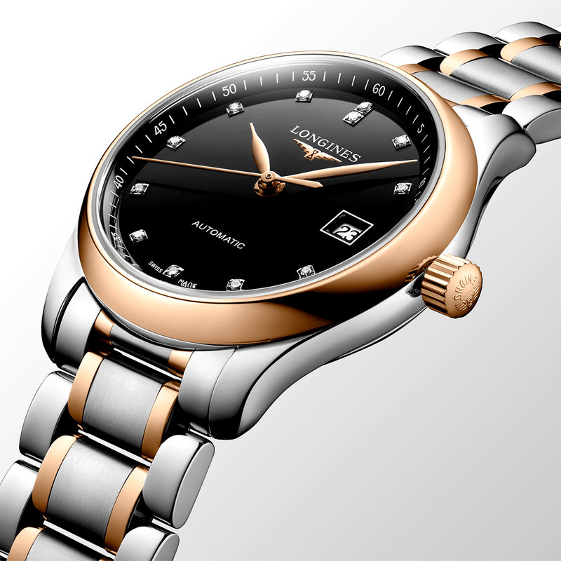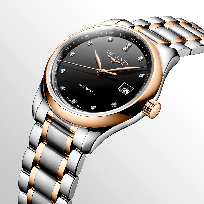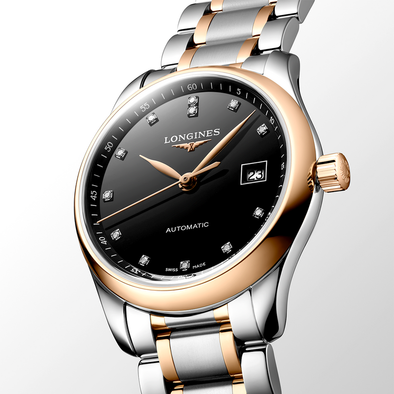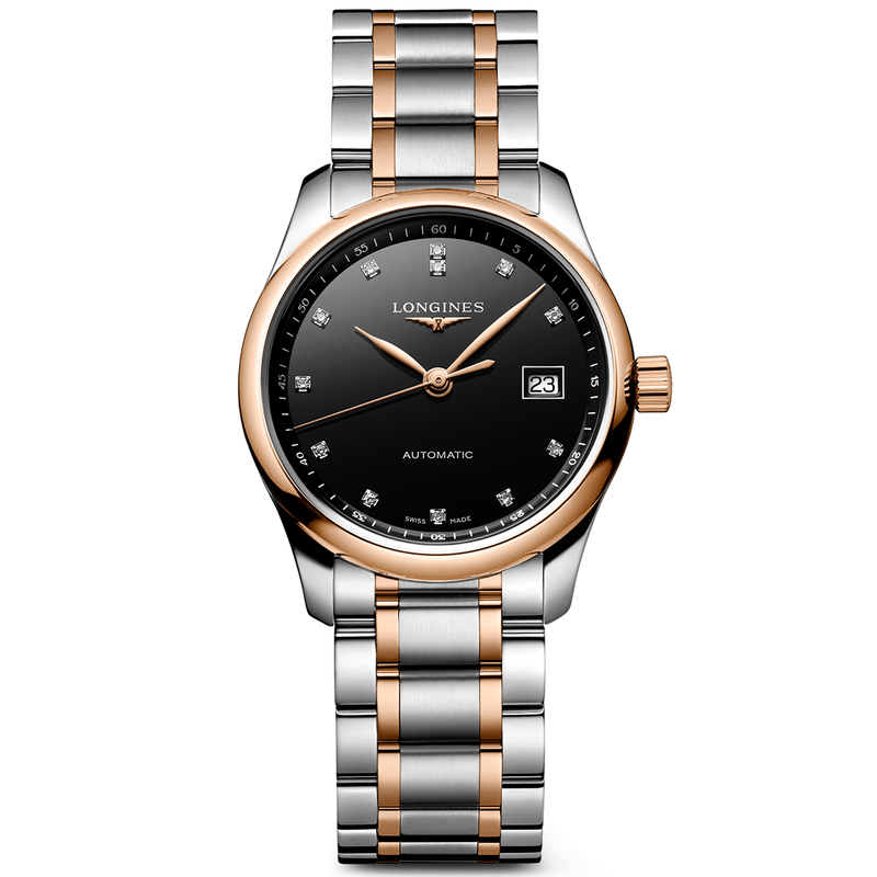 Longines Master Collection 29mm Black Diamond Dial Strap Watch L22575597 . Stainless steel 29mm rounded case and bezel, all featured on a stainless steel and rose gold two tone bracelet with a triple safety folding clasp and push-piece opening mechanism. This ladies watch has a black sunray dial with polished hands and 12 diamond set hour markers, date display at the 3 o'clock position. Sapphire crystal glass and water resistant up to a total of 30 metres. L592 automatic movement with 45 hours of power reserve.