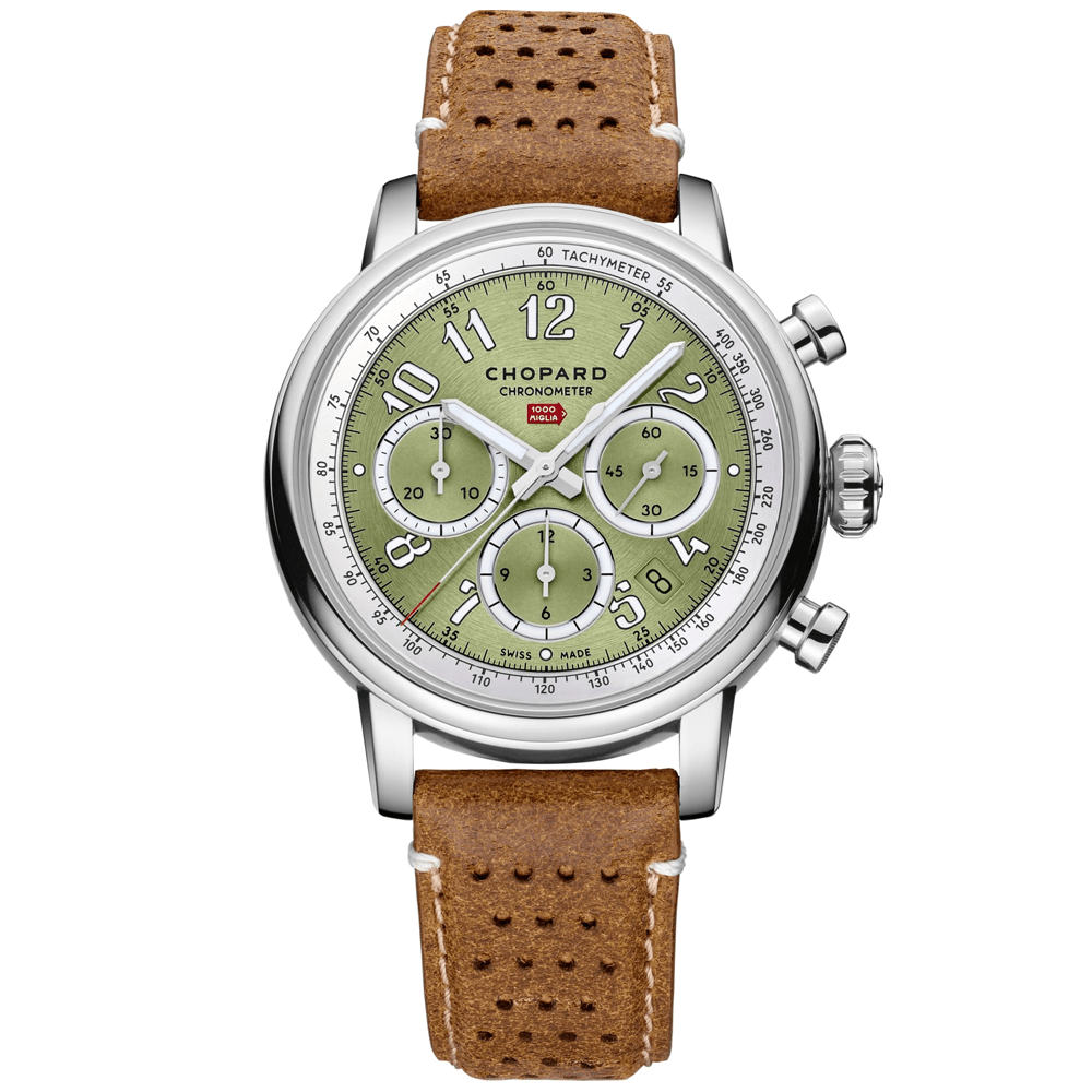 Chopard Mille Miglia Classic Chronograph Steel Automatic Strap Watch - 168619-3004 Lucent steel 40.5mm rounded case and bezel, all featured on a brown calfskin perforated leather strap with pin-buckle fastening. This men's watch has a Lacquered "Verde Chiaro" green dial with Arabic numerals coated with Super-LumiNova, as well as 3 chronograph counters and a date display at the 4:30 position. Scratch resistant sapphire crystal glass and water resistant up to a total of 50 metres. Automatic movement.