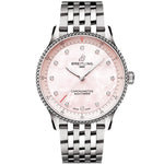 Breitling Navitimer 32mm Pink Mother of Pearl Diamond Dial Bracelet Watch A77320D91K1A1. Stainless steel 32mm case and beaded bezel all on a matching stainless steel bracelet. This ladies watch has a pink mother of pearl dial with polished hands and 12 lab-grown diamond set hour markers, red tipped seconds hand. Sapphire crystal glass and water resistant up to 30m. Quartz movement.