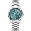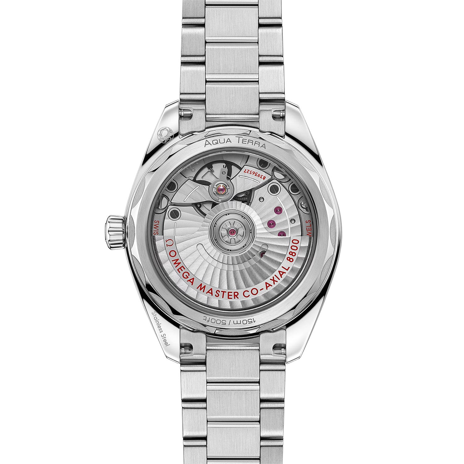 Paying tribute to Omega’s rich maritime history, this classic-looking dive watch for women Features a robust stainless steel case measuring a diameter on the wrist of 34mm. It also presents the time on an alluring lagoon green-coloured dial. The lady’s Omega Seamaster Aqua Terra watch boasts entrancing 18ct white gold hands and indexes that have been treated with a layer of Super-LumiNova for assisted timekeeping in the dark. The dial also Features a date window at 6 o’clock and is protected underneath a strong piece of anti-reflective and scratch-resistant sapphire crystal. The same sapphire crystal glass material is also repeated on the other side of the case, where an in-house Omega movement is put on show. The Calibre 8800 is certified at the industry’s highest standard by the Swiss Federal Institute of Metrology (METAS) and provides a power reserve of 55 hours once fully wound. The lady’s Omega Seamaster Aqua Terra watch is fitted on a robust stainless steel bracelet with rounded links executed in a mix of polished and brushed finishes.
