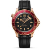 OMEGA Seamaster Diver 300m Bronze Gold Burgundy Red Strap Watch 21092422001003. bronze gold 42mm case and burgundy red aluminium bezel all on a black rubber strap. This men's watch has a black dial with bronze golden & luminous applied hands and hour markers. Sapphire crystal glass and water resistant up to 300m. Power reserve up to 55 hours. OMEGA 8806 automatic movement.