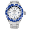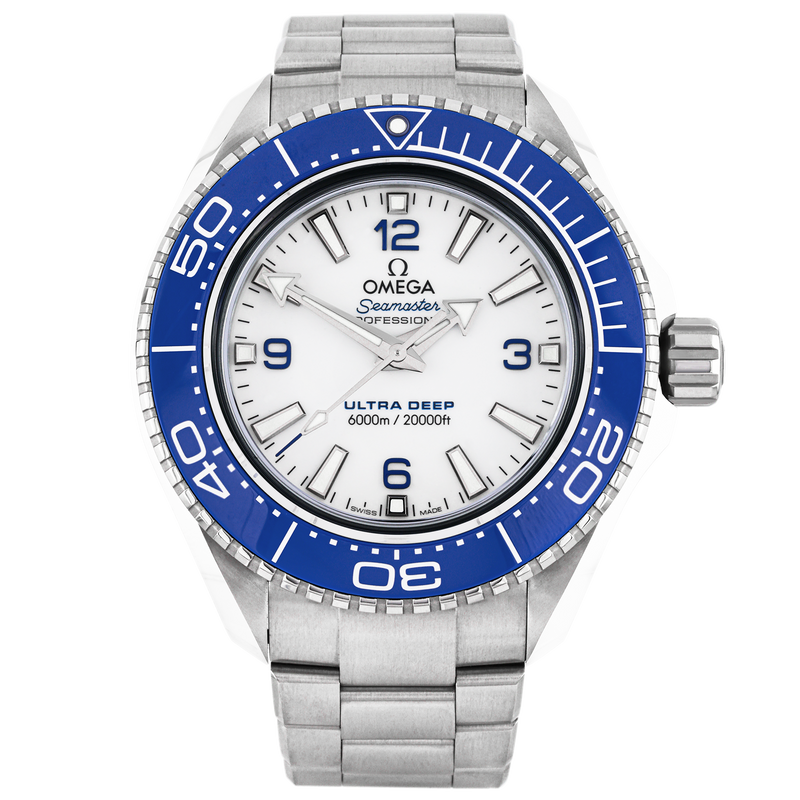 OMEGA Seamaster Planet Ocean 6000m Ultra Deep Watch (2023) 105 P-O 21530462104001. O-MEGASTEEL 45.5mm case and polished blue ceramic bezel all on an O-MEGASTEEL bracelet. This watch has a white dial with blue detail. Sapphire crystal glass and water resistant up to 6000m. Automatic movement.