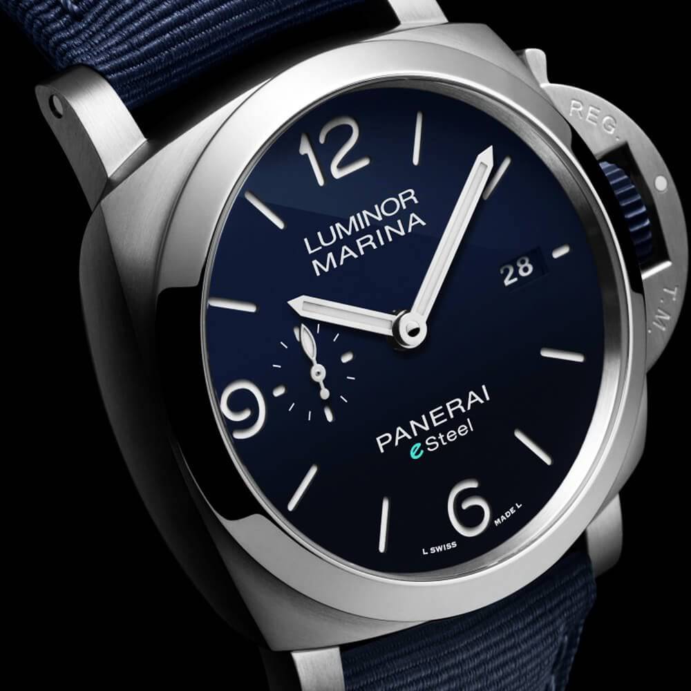 Panerai Luminor Marina ESteel Blu Profondo 44mm Men's Automatic Watch PAM01157. Polished ESteel 44mm case and bezel which is 58.4% made from recycled materials as well as a recycled textile strap. This men's watch has a polished blue gradient dial with date display at the 3 and seconds sub dial at the 9 o'clock positions. Water resistant up to 300m and sapphire crystal glass. Automatic mechanical, P.9010 calibre, executed entirely by Panerai, 13¾ lignes, 6.0 mm thick, 31 jewels, Glucydur® balance, 28,800 alternations/hour. Incabloc® anti-shock device. Power reserve 3 days, two barrels. 200 components.