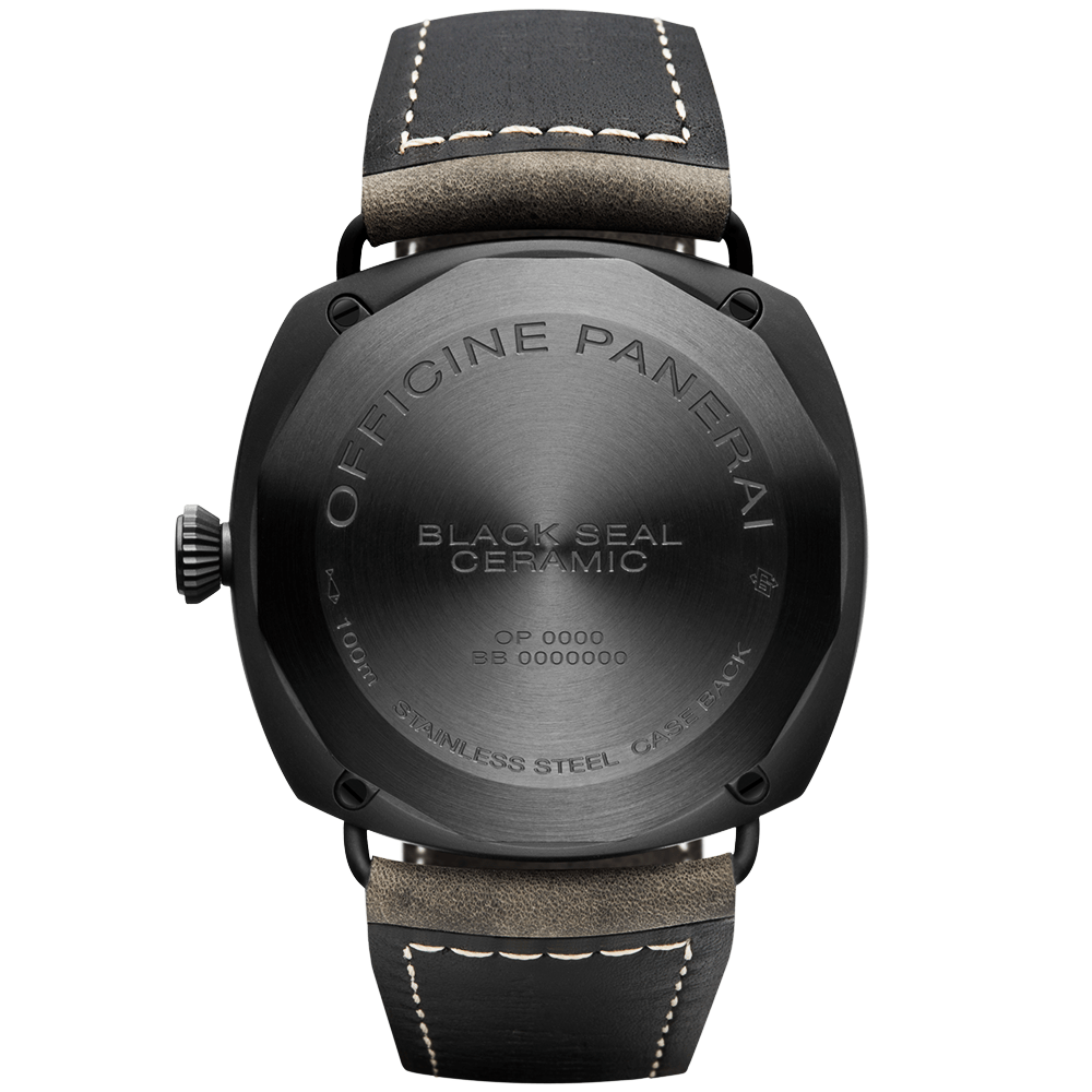 Crafted from Panerai’s high-tech ceramic, this Radiomir Ceramica watch boasts a domineering 45mm diameter and comes clothed in this sleek all-black aesthetic. The ceramic case is made up of zirconium oxide which begins as a powder that is pressed to give the watch its extreme hardness, superseding that of stainless steel by five times. The Panerai Radiomir Ceramica watch Features a black hobnail-effect dial with luminous Arabic numerals at 12, 3, 6 and 9 o’clock as well as luminous hands that glide over the surface of the famous Radiomir and Panerai lettering effortlessly. The hands are driven by the Panerai OP X movement. This hand-wound movement provides a 56-hour power reserve once fully wound and performs at a rate of 21,600 oscillations per hour. The black case of the men’s 45mm Panerai Radiomir Ceramica watch is completed on a black calfskin leather strap with beige contrast stitching down the edges.