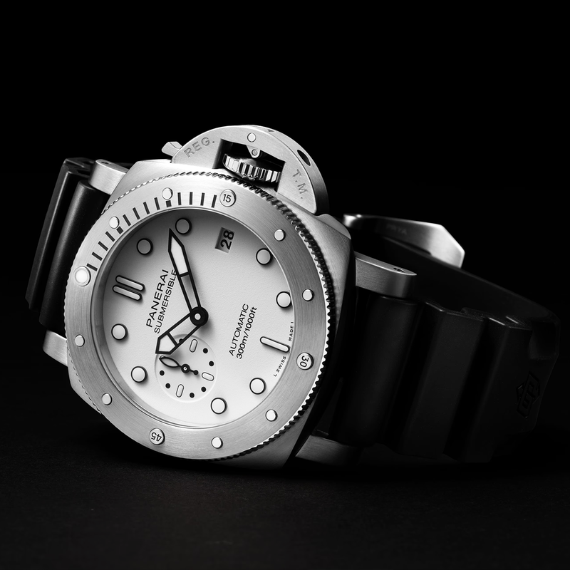 The Panerai Submersible Bianco puts a new clean spin on the Submersible watch with its striking white dial. The 42mm dive watch is crafted from brushed 316L stainless steel and has been equipped with a water resistant capability of 300 meters. Panerai has always been proud of its heritage in creating submersible watches for military personnel. This model Features hands and hour markers that have been treated with luminous material to assist with timekeeping in dark conditions. A unidirectional rotating bezel with a legible dive scale upon its surface enables the wearer to measure elapsed time underwater without running the risk of accidentally extending dive time. This feature surrounds the white dial with a date window placed at 3 o’clock and a small second sub-dial located at 9 o’clock. This men’s Panerai Submersible Bianco watch also Features the instantly recognisable crown protecting bridge at 3 o’clock on the case and comes fitted on a comfortable black Caoutchouc rubber strap with a matching stainless steel buckle. The watch is powered by the automatic P.900 calibre, integrated with Incabloc technology and can produce a 3-day power reserve.